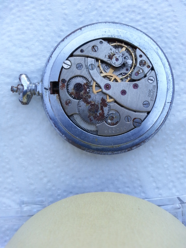 Das Uhrwerk selbst zeigt nur kleinere leichte Rostflecken. Ich denke nach einer Generalüberholung beim Uhrmacher sollte sie wieder funktionieren.
