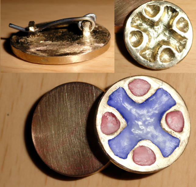 Meine Grubenschmelzfibel mit Kreuzmotiv, ungefähr 9. Jahrundert nach einer vorläufigen Schätzung.