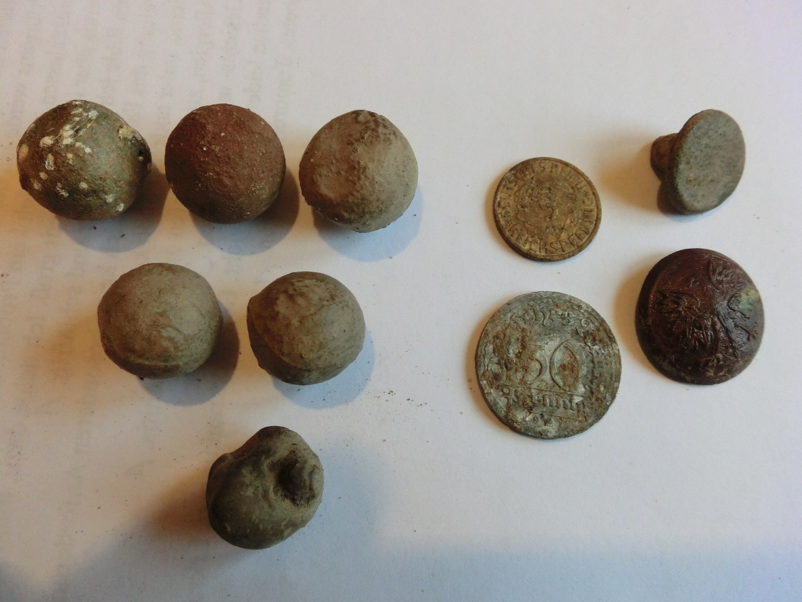 ich war wieder in Kunersdorf auf einem der Schlachtfelder des 7-jährigen Krieges. Einerseits kämpften dort im 18. Jh. Friedrich II gegen Russen und Österreicher, im WK II wurde genau dort aber auch stark gekämpft. Insbesondere interessieren mich die beiden Knöpfe hier. Einer ist eindeutig aus Kupfer mit polnischem Adler drauf. Aus welcher Zeit könnte der wohl stammen? Ist es ein Uniformknopf? Der andere ist etwas kleiner und trägt keine Gravur, ist aber ebenfalls aus Kupfer denke ich. Bei den Musketenkugeln gibts eindeutige Größenunterschiede. Die oberen 3 sind größer als die beiden darunter. Die Kugel ganz unten ist infolge Einschlag deformiert. Kann man anhand der Größe der Kugeln bestimmen ob es Kugeln der Preussen, der Russen oder der Österreicher waren?