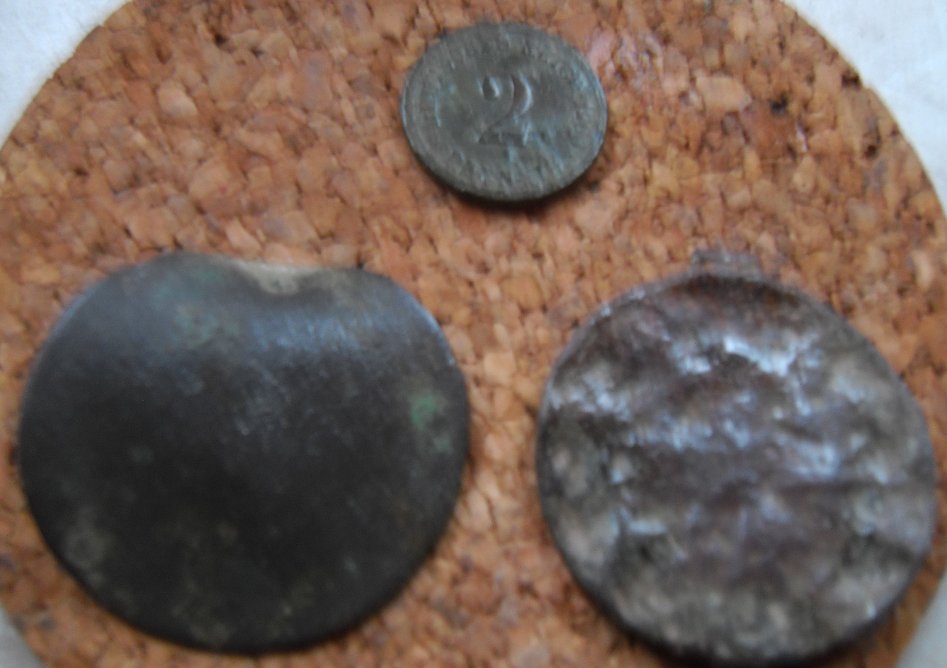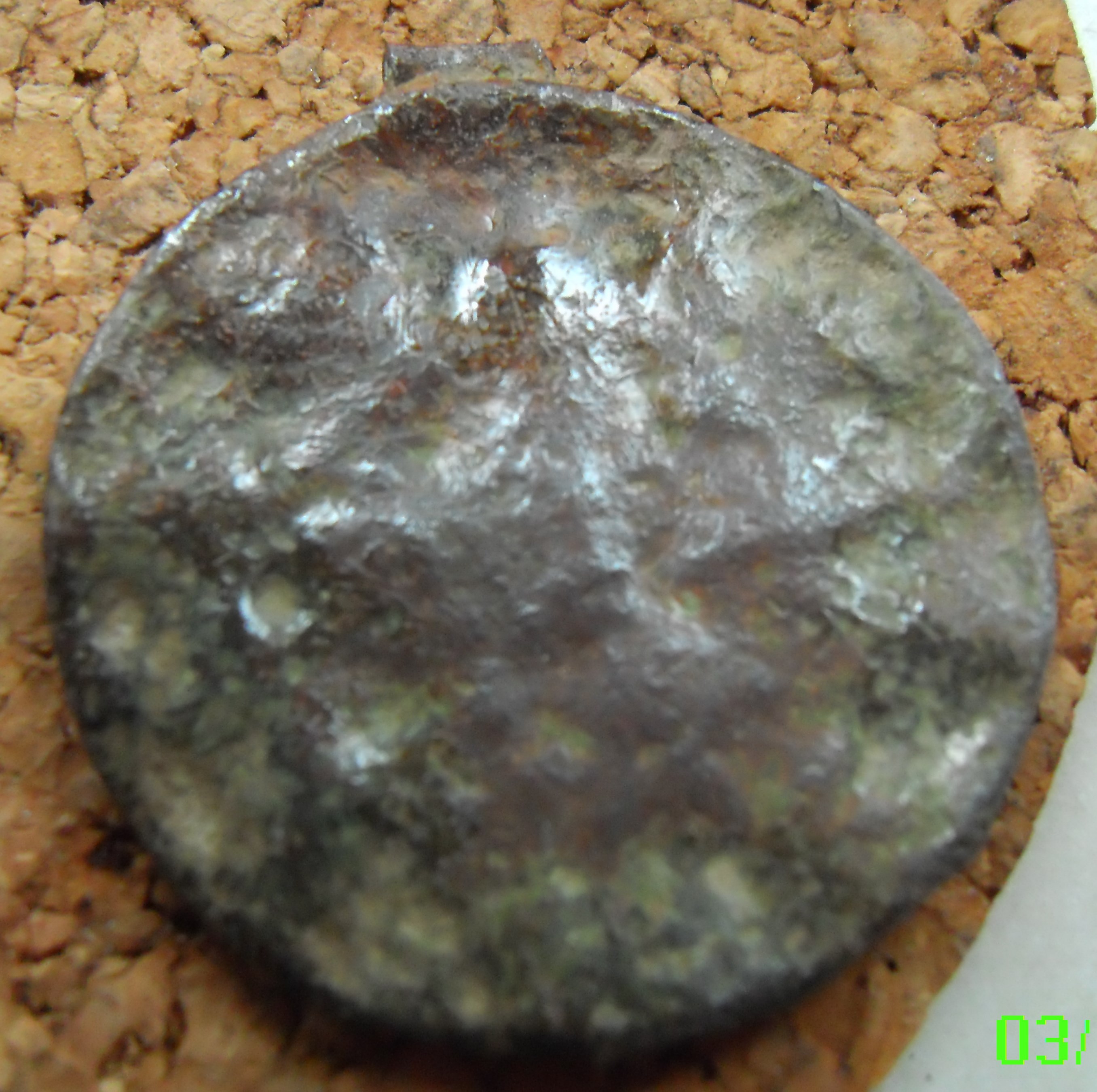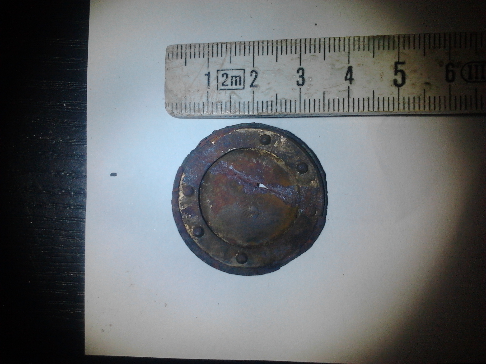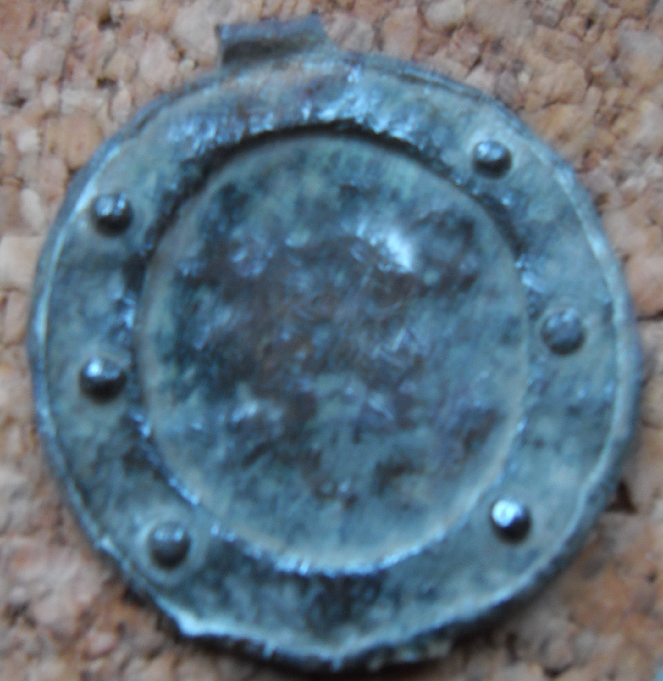 ich habe heute neben 1 reichspfennig 1930 und ner getreideplombe auch diese teil gefunden. beim aufnehmen dachte ich erst an einen dosenboden .doch nach der reinigung kam ein rest einer prägung zum vorschein ebenso wie die nieten am rand.
