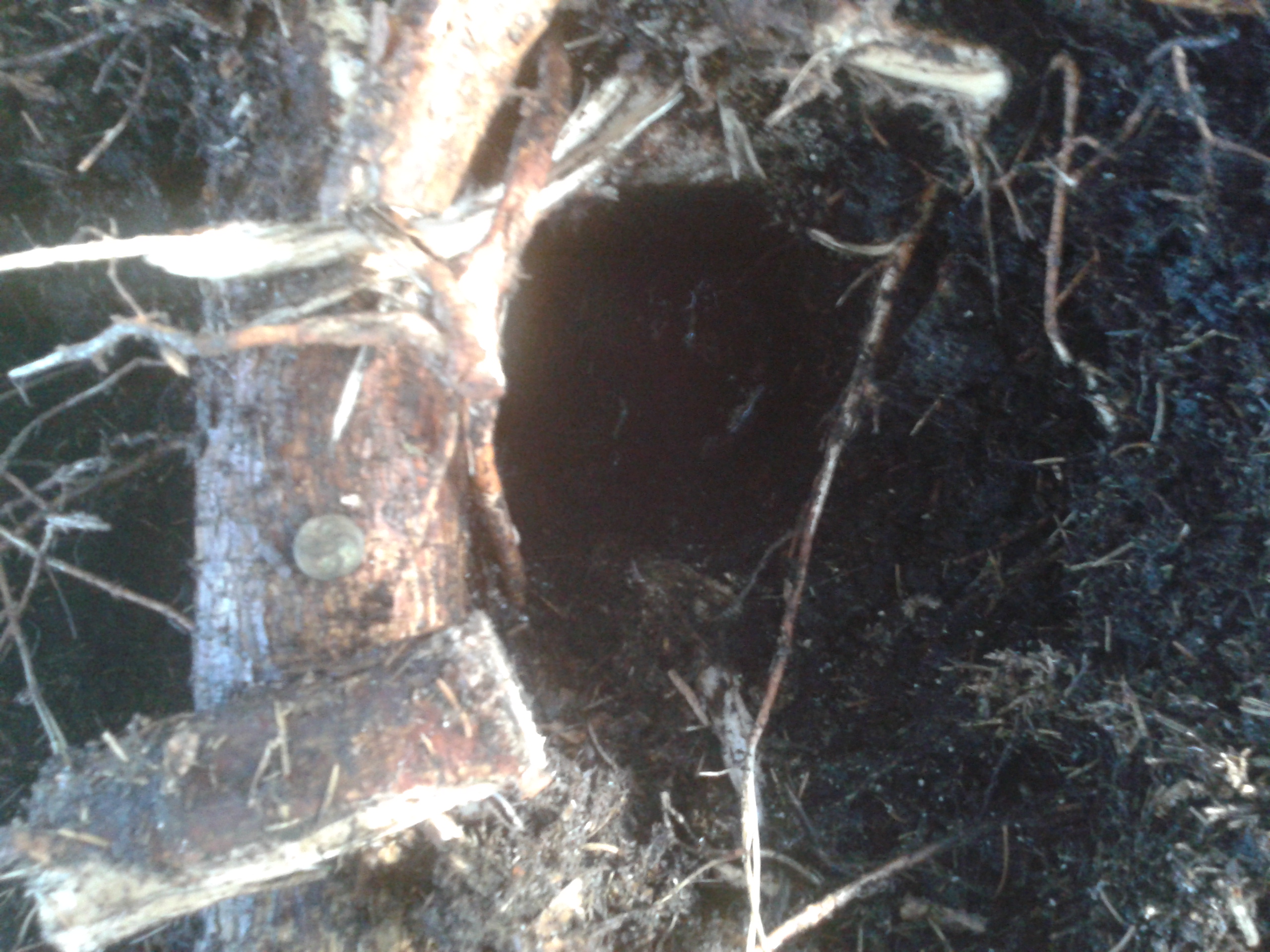 Bild 4: Fundort des Knopfes etwa 20cm unter Wurzeln, hier hat sich mein Spaten mit integrierter Säge voll bewährt, sonst wäre ich nicht rangekommen.
