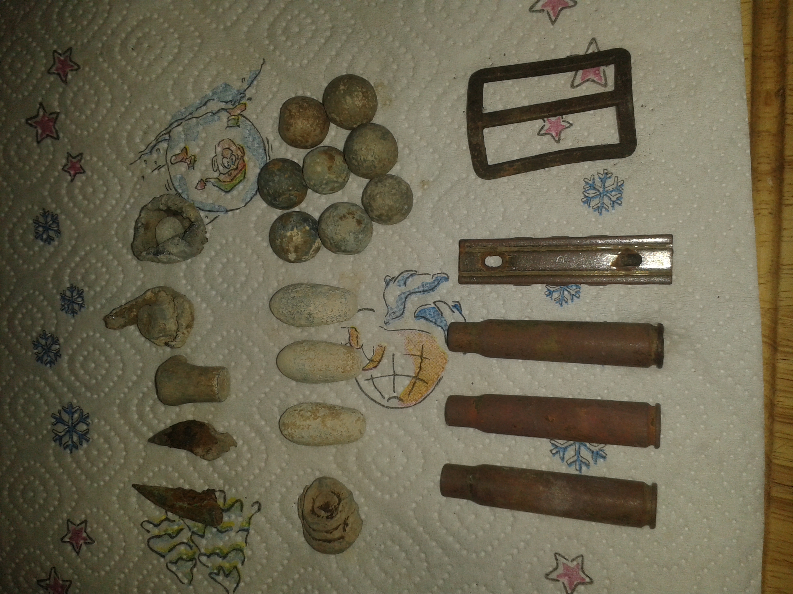 Heute kamen einige Sachen aus dem Boden, das meiste ist bekannt, aber bei drei Geschossen frage ich mich ob das eventuell Nachfolger von Musketenkugeln waren. Von der Stärke am Kopf stimmen sie in etwa mit denen der Musketenkugeln überein, nur das sie dann nach hinten schmaler werden.