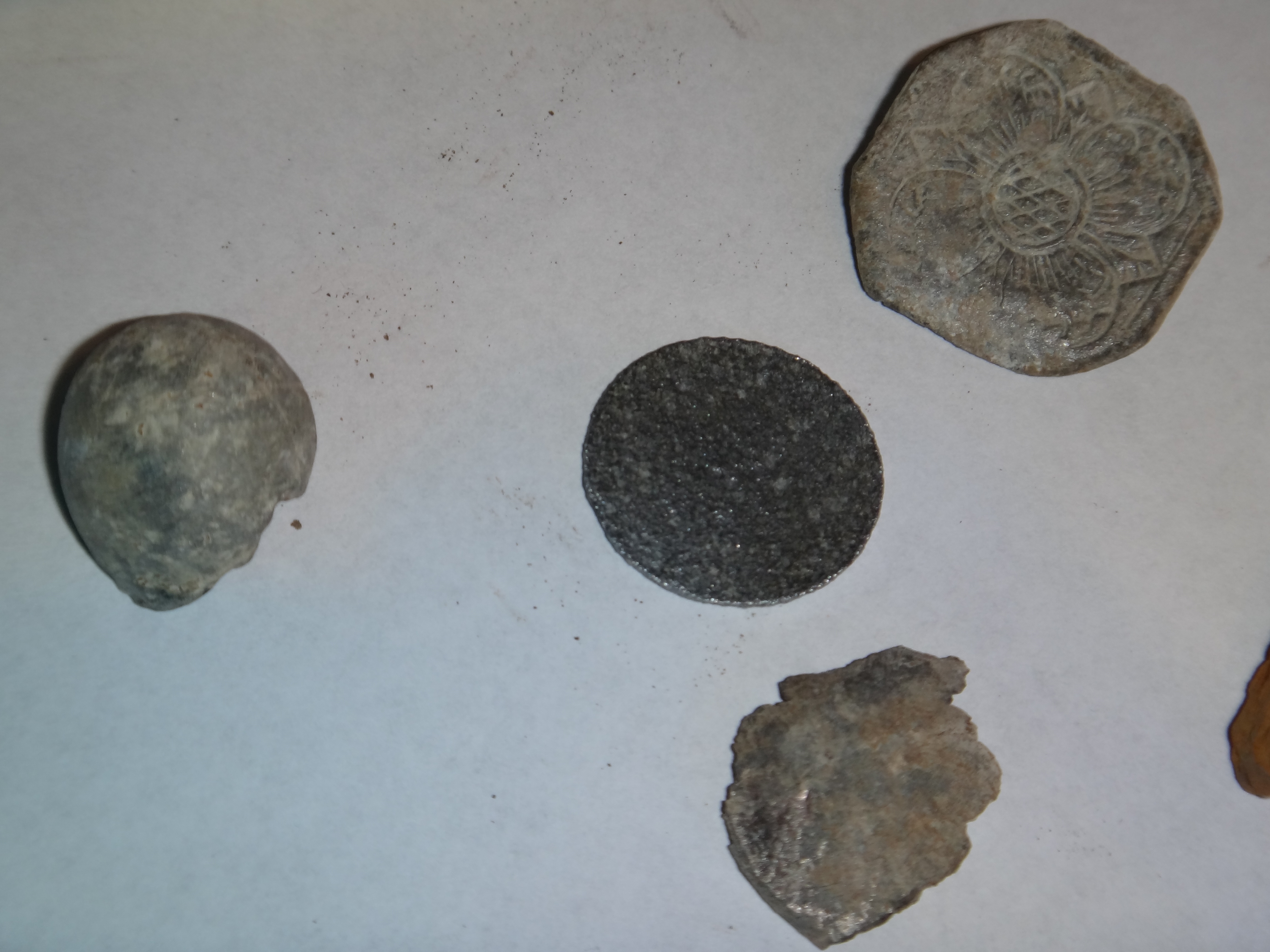 Eine Münze, leider nicht mehr erkennbar Ausser einer ganz schwachen 10. Ein Knopf, wie es aussieht wahrscheindlich mit Blumenmuster. Eine Musketenkugel, ein Altes Fernrohr und etwas Schrott