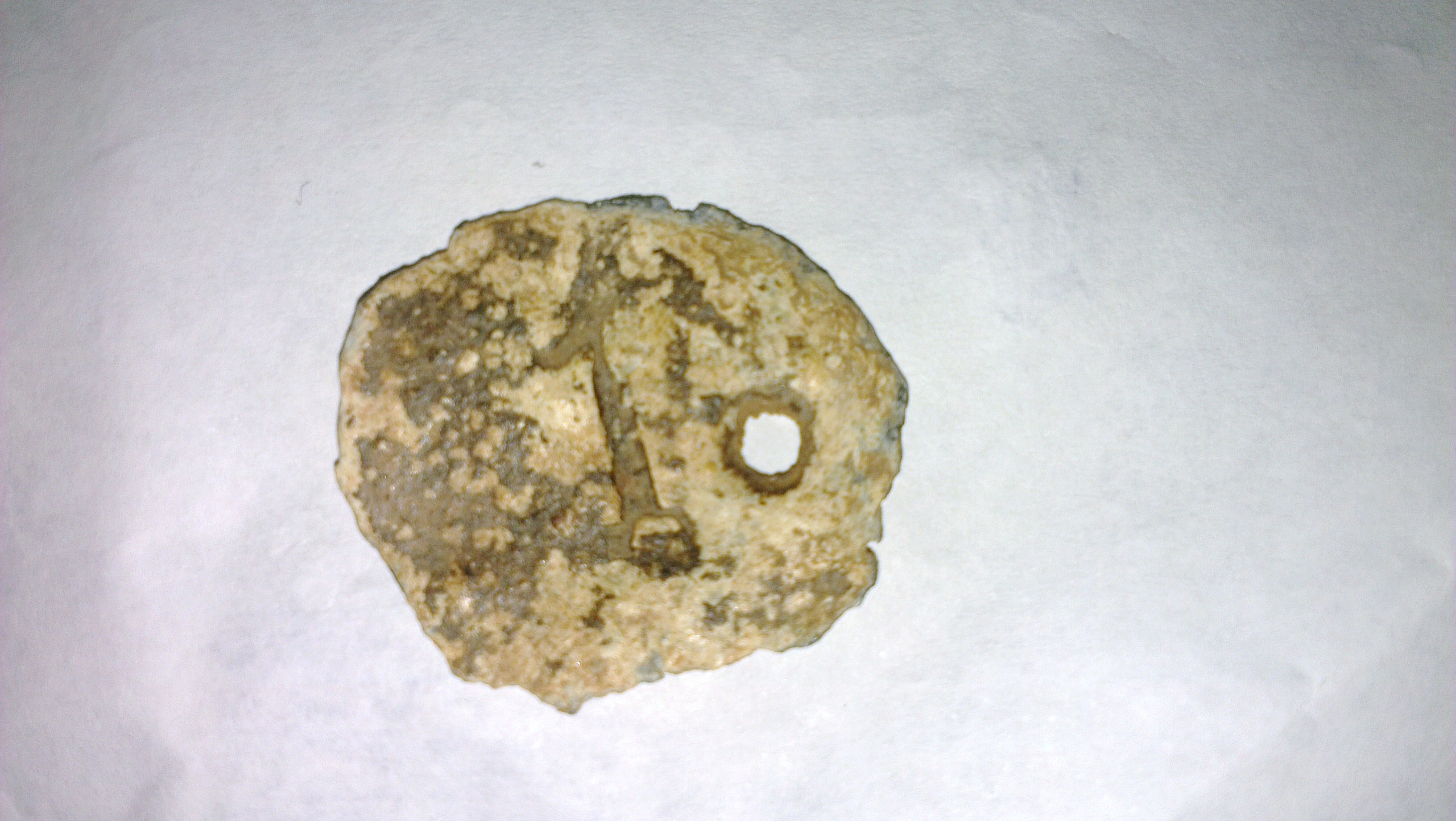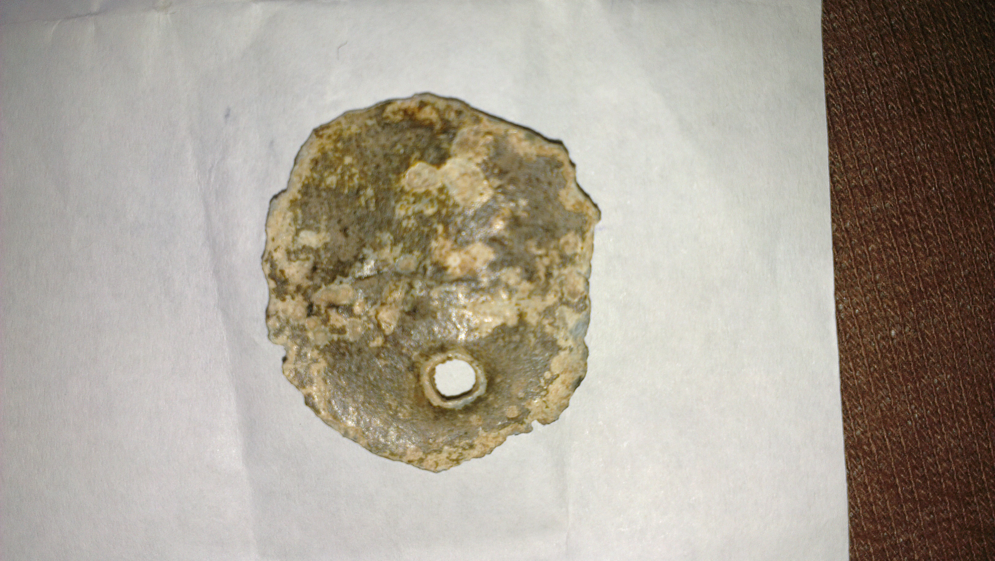 Denn das Loch schaut aus als wenn da einfach ein Nagel durchgeschlagen wurde, ohne vorher ein Loch zu bohren, daher die grobe Wölbung auf der Rückseite.