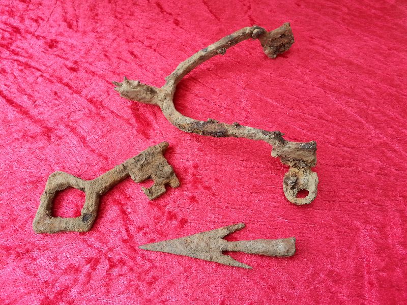 eine würzburger münze lodenburg 12. jh., radsporen, gotischer schlüssel und eine perfekte pfeilspitze