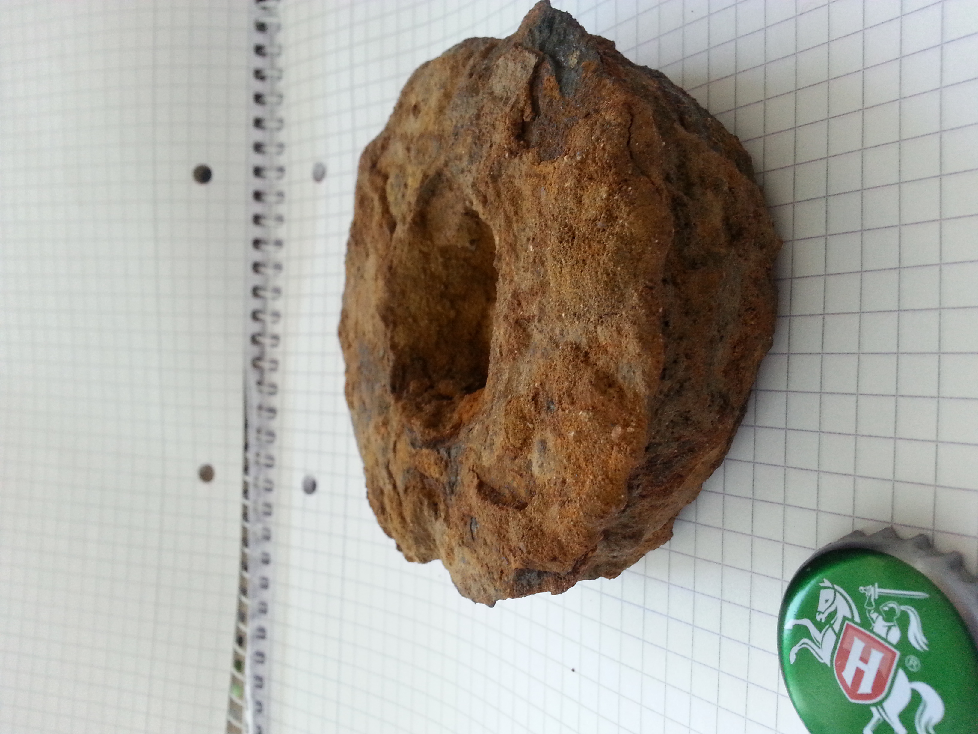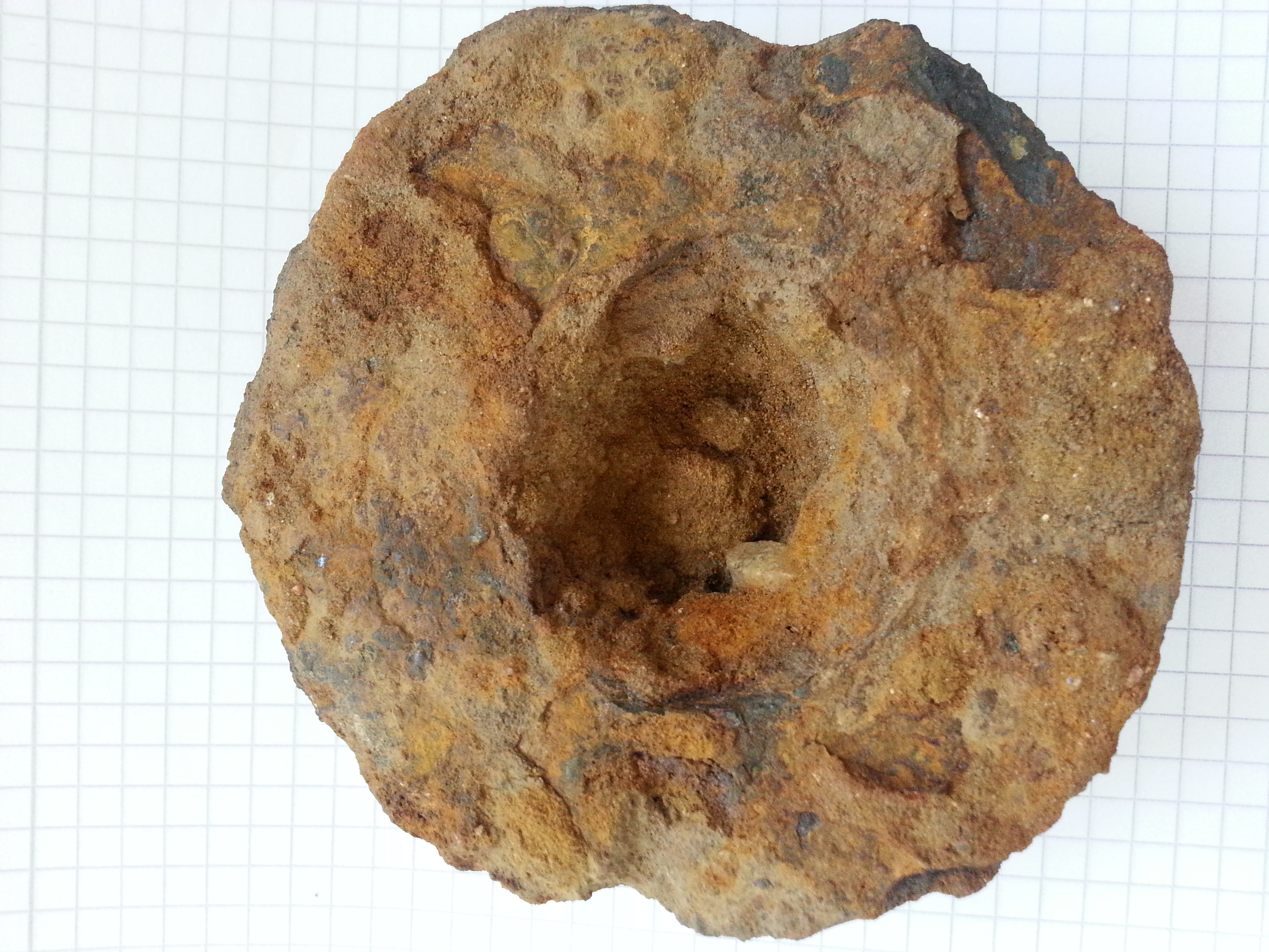 Neben ein paar Metallschrottfunden haben wir auch ein rundes "Ding" gefunden. Es scheint massiv aus Eisen zu sein (Gewicht 857gr) und hat, wie ein Hydratendeckel eine Einbettung in der Mitte.
