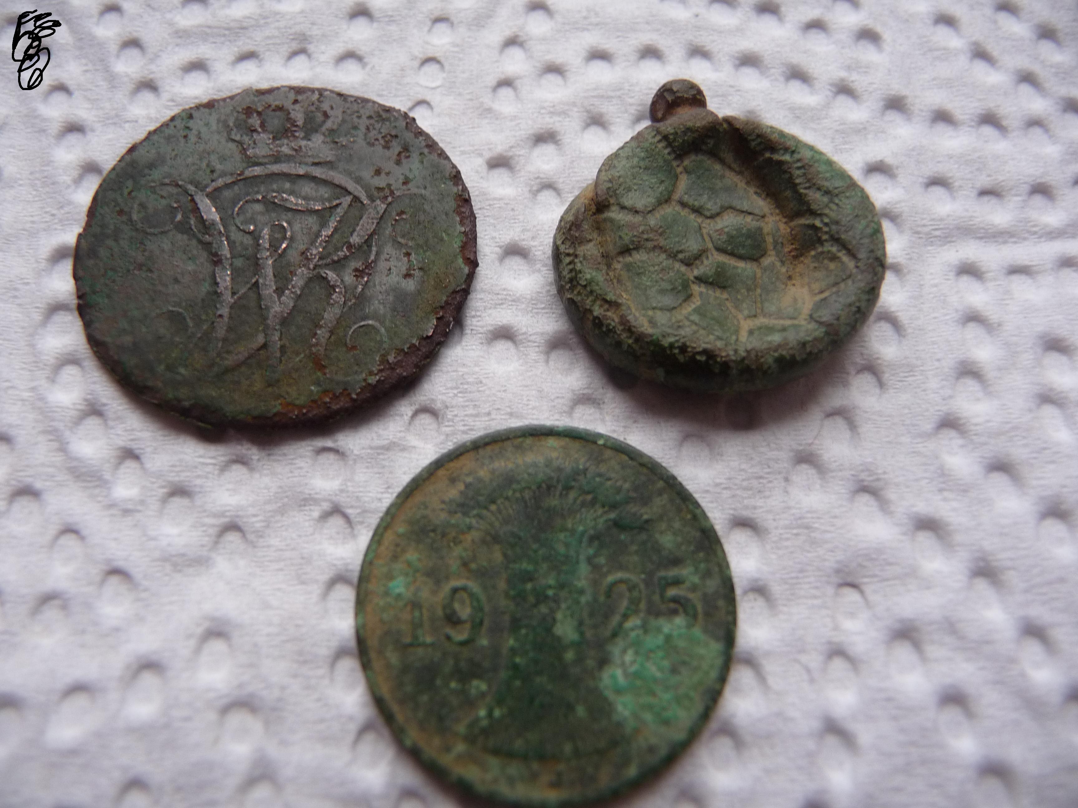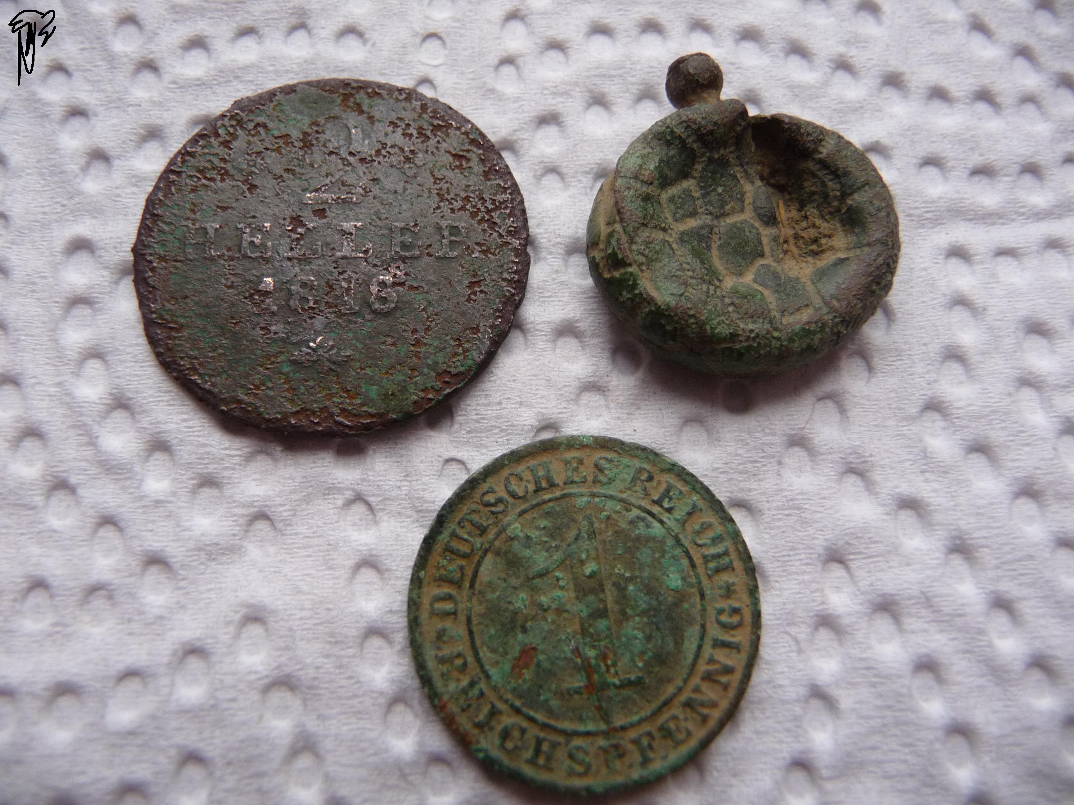 2 Heller 1818, 1 Pfennig 1925, Musketenkugel, Schnalle, Bleiplombe.