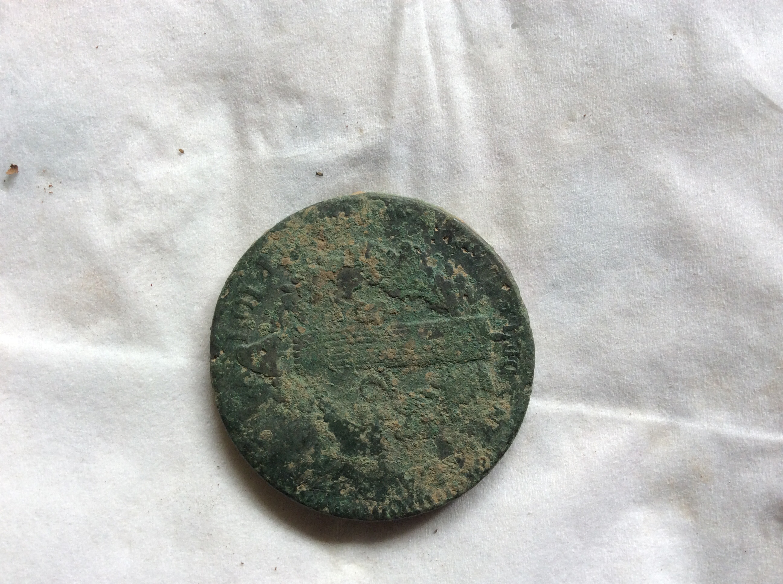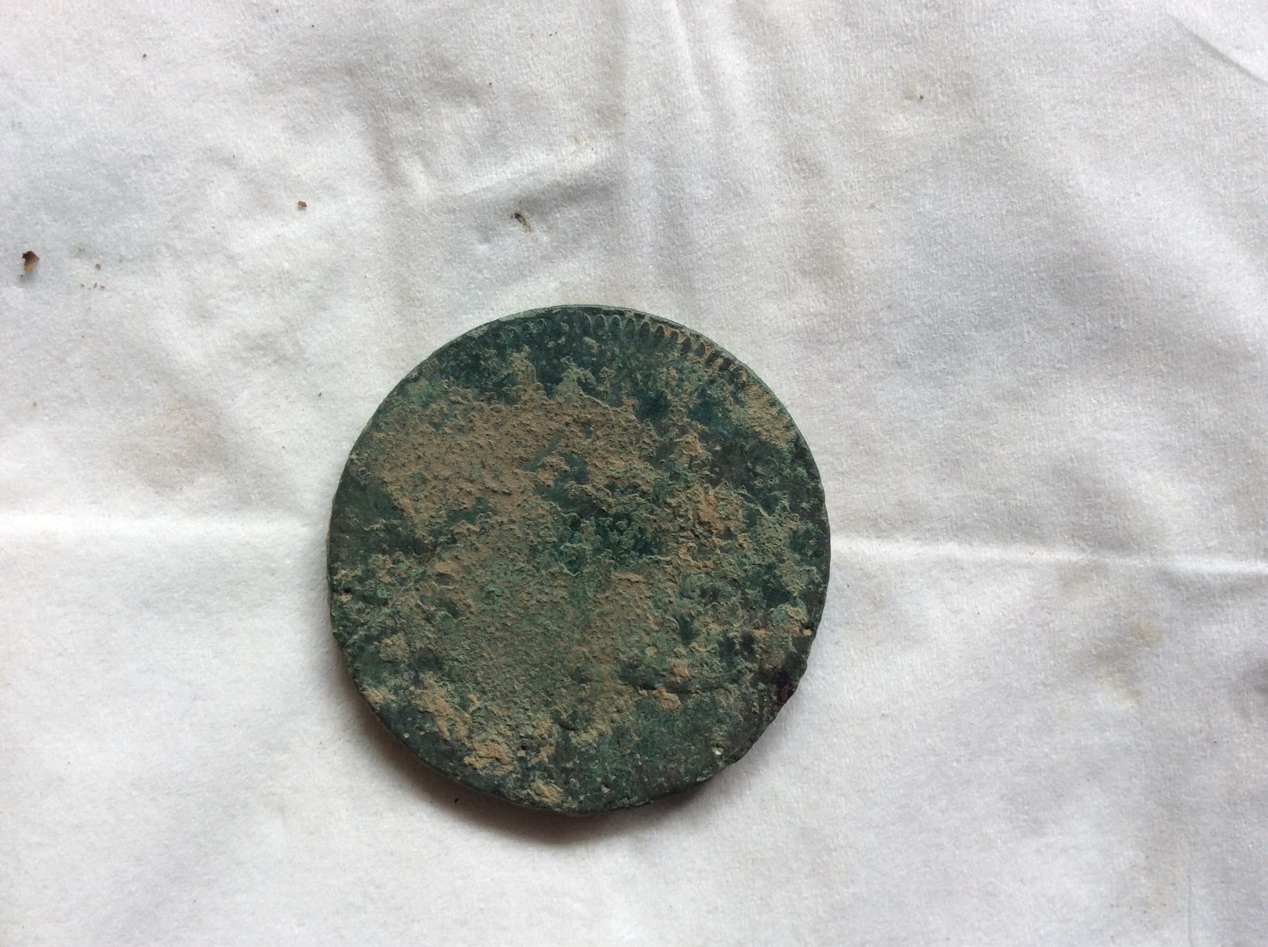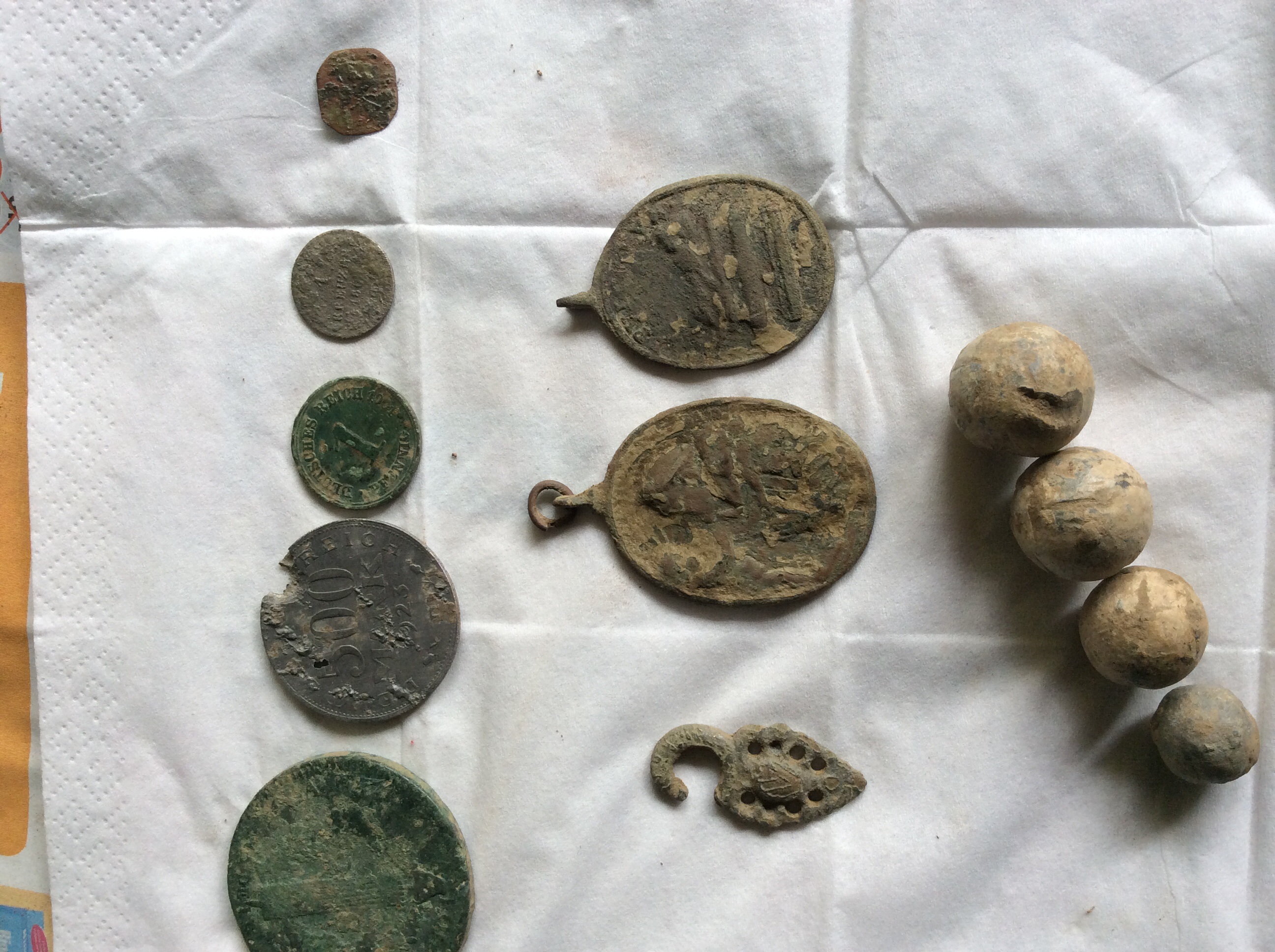 Kann mir einer was zu der großen Münze und den Anhängern sagen? Sind schon sehr demoliert. Und das kleine viereckige Blättchen IST sehr dünn, sieht aber auch aus, als wär da was drauf gewesen. Kann der Haken zu Alter Kleidung gehören? :thumbdown .