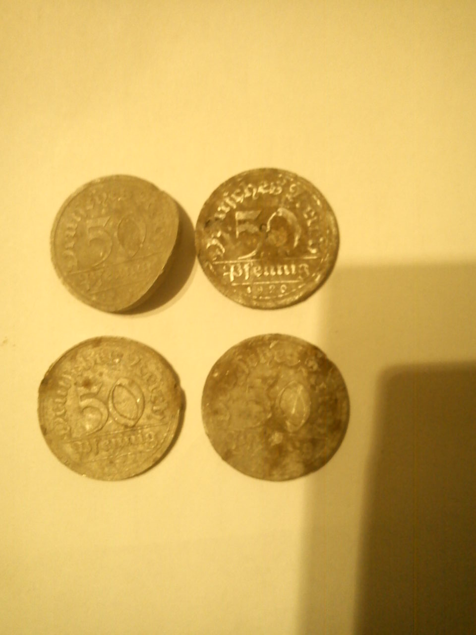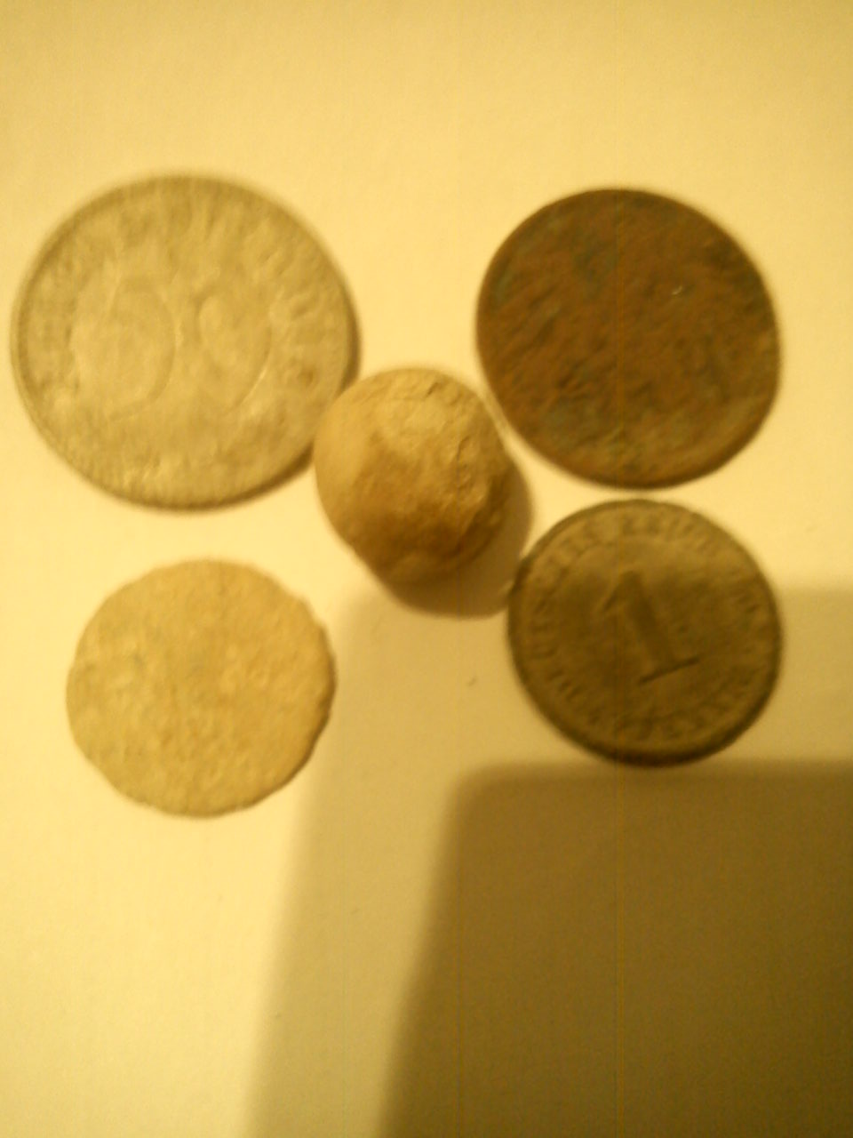 OK. Die Funde waren jetzt nichts weltbewegendes ,aber die Bauern waren sprachlos. Alles in Allem ein Paar Knöppe, ein Teil von nem Pferdegeschirr (hat der Bauer gewusst),4 mal 50 Pfennig Infla. , ein Fünzigerl 3. Reich aber noch ohne HK . Ein 10 Reichpfennig und ein Pfennigstück Kaiserreich, ne Münzleiche(denk mal ein Pfennig 3.reich) Ein 10 Kronenstück aus Tschechien das schon übel aussieht obwohl es wohl weniger als 20 Jahre im Boden lag.