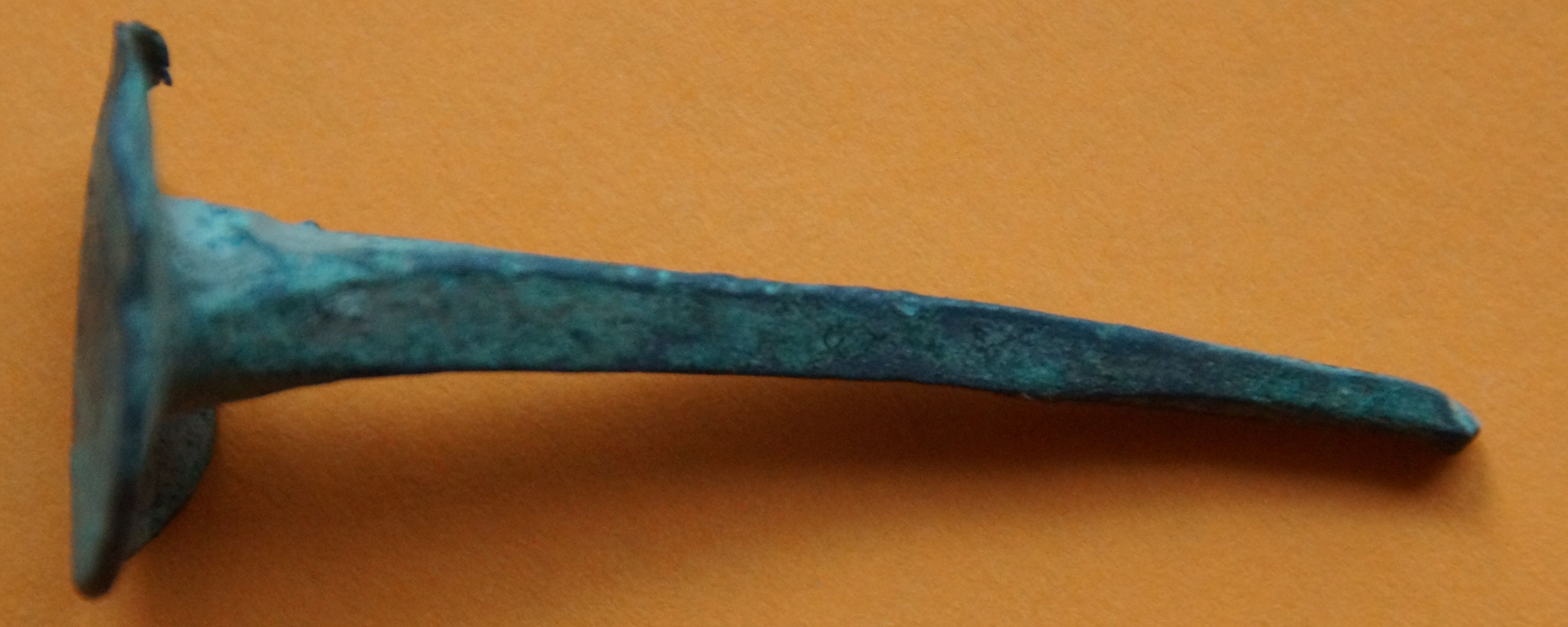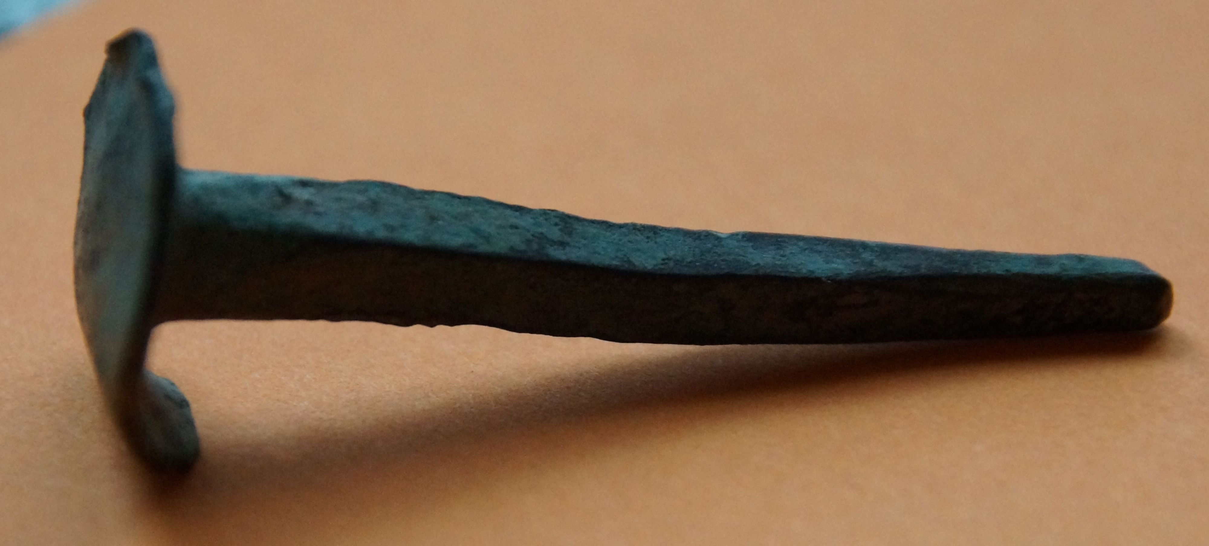 Einen Kupfernagel, etwa 6 cm lang und sehr gut erhalten.