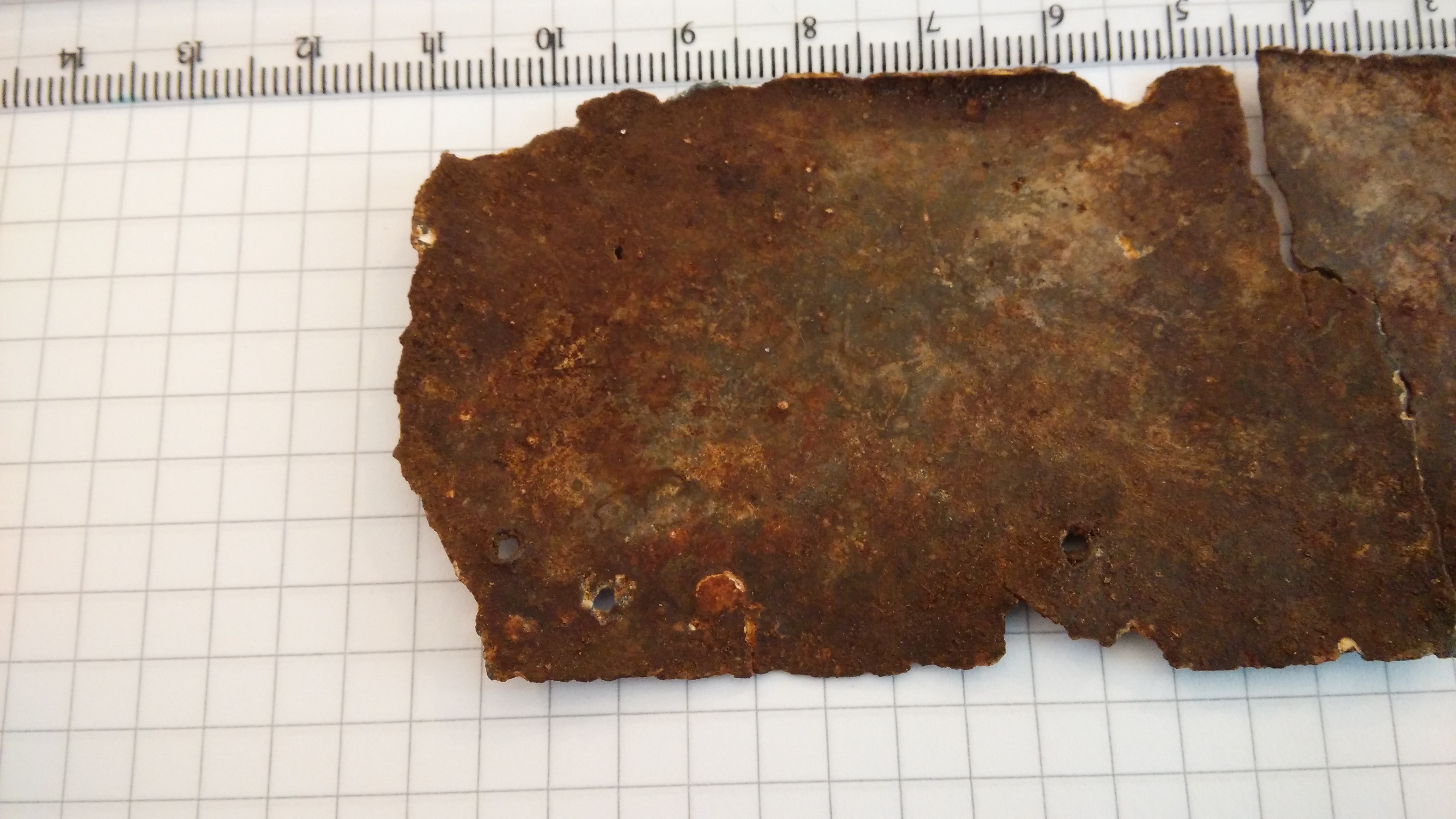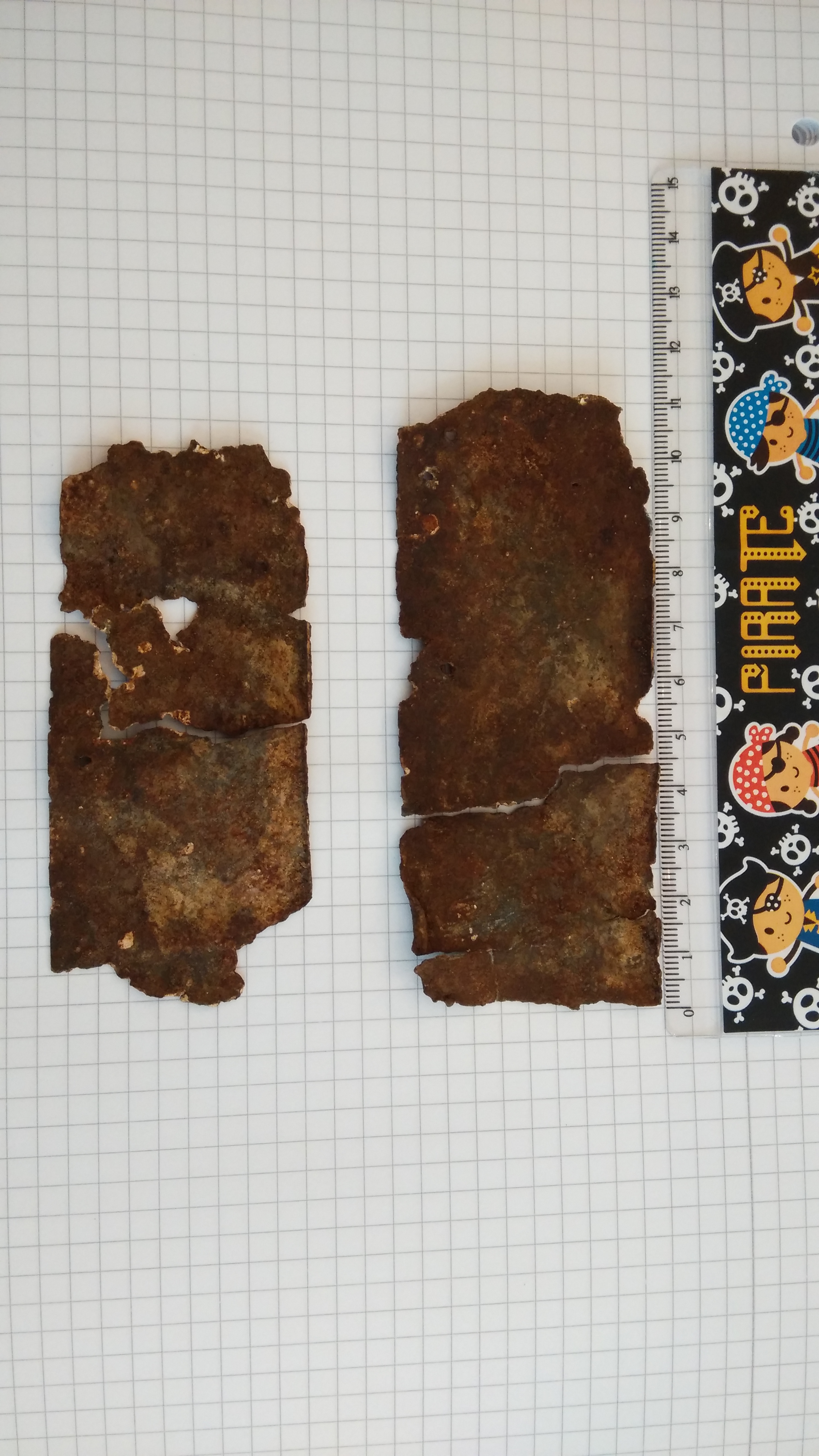 Die Teile habe ich mit einer Handschaufel ausgegraben. Die vier Stücke gehören zusammen, haben an den Ecken mindestens 2 Löcher und die langen Seiten sind jeweils etwas gebogen. Als ob etwas damit umschlossen wurde. Da es nicht rostig ist gehe ich nicht von Eisen aus.
