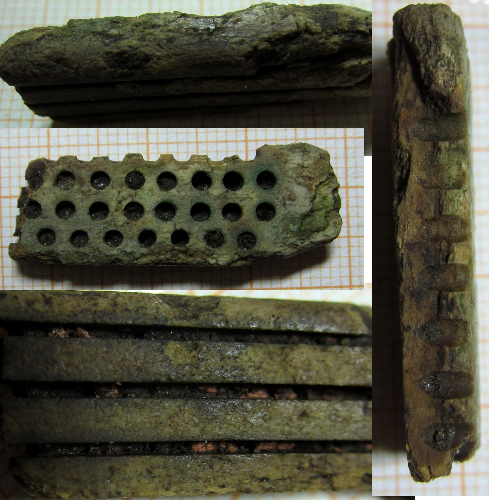 is Knochen, eine der Längsseiten ungebrochene geglättete Kante u das Zeug in den Rillen ......keine Ahnung ob Pigment o Knochenschimmel