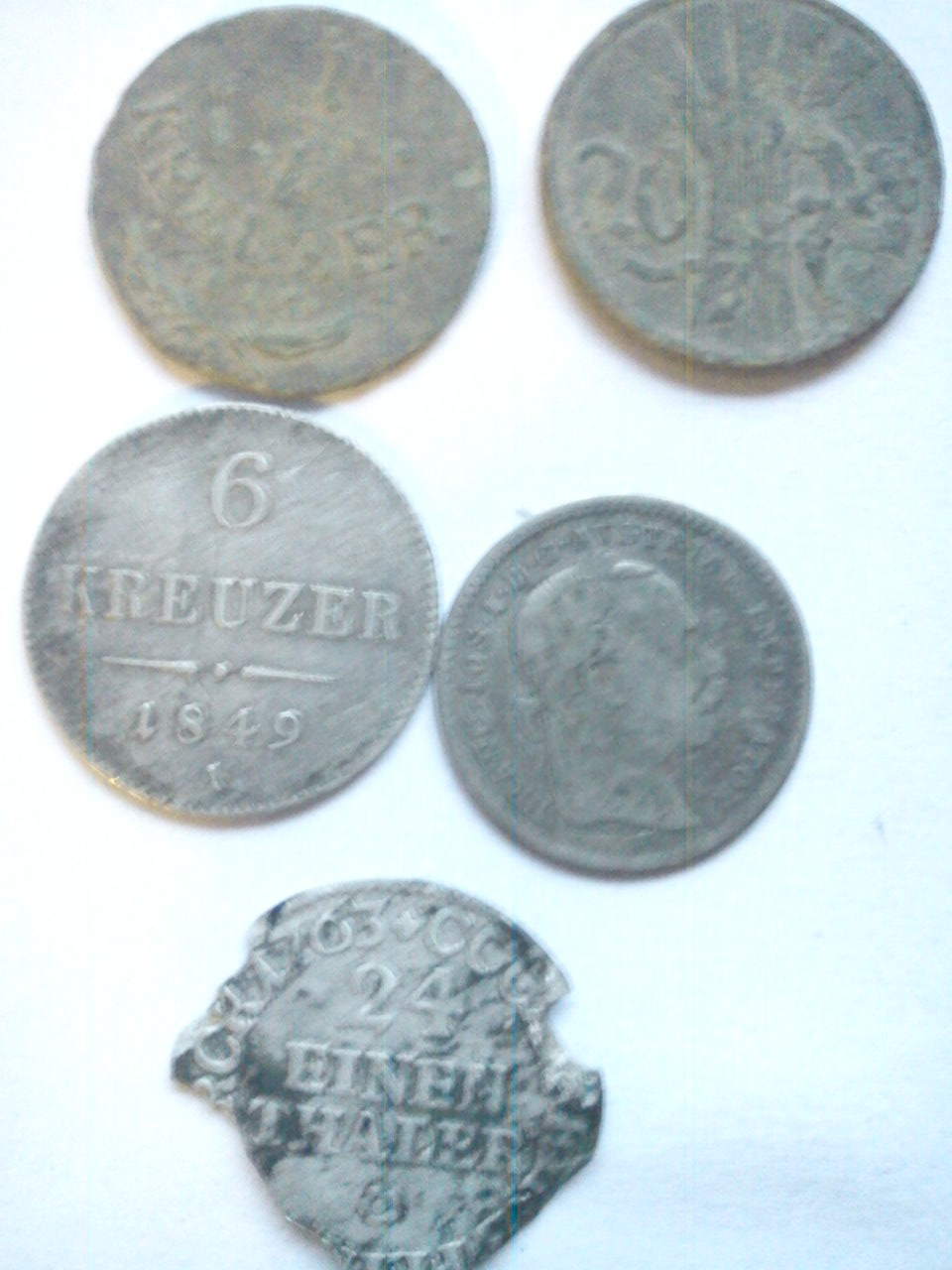 War mal wieder Richtung Grenze unterwegs und habe halbwegs gute Funde gemacht. Heute war es dann soweit. die erste sächsische Silbermünz kam zum Vorschein.Leider arg mitgenommen. Dafür sind die 2 östereichischen Silberlinge noch recht gut.Anders rum wäre mir aber lieber gewesen.