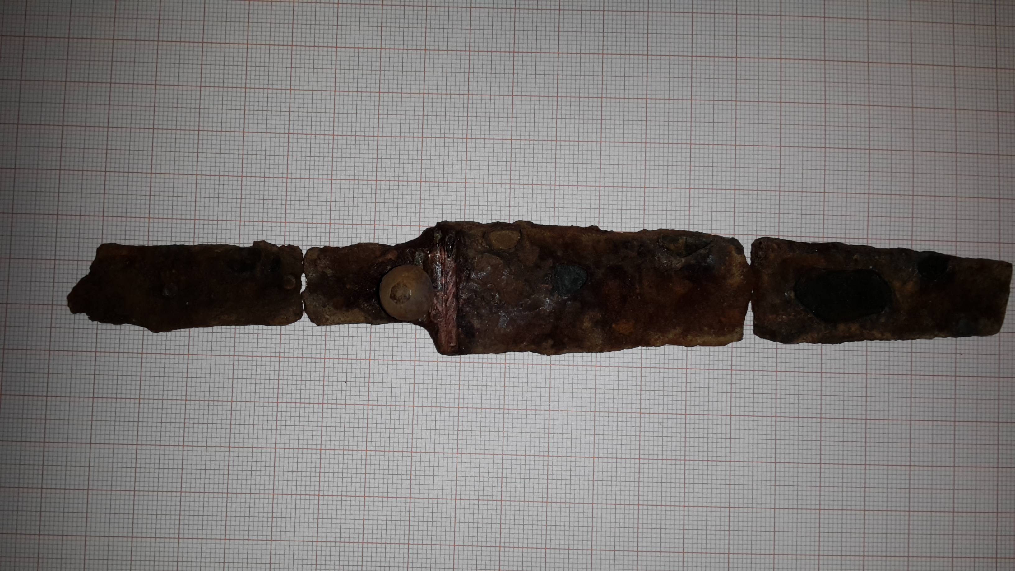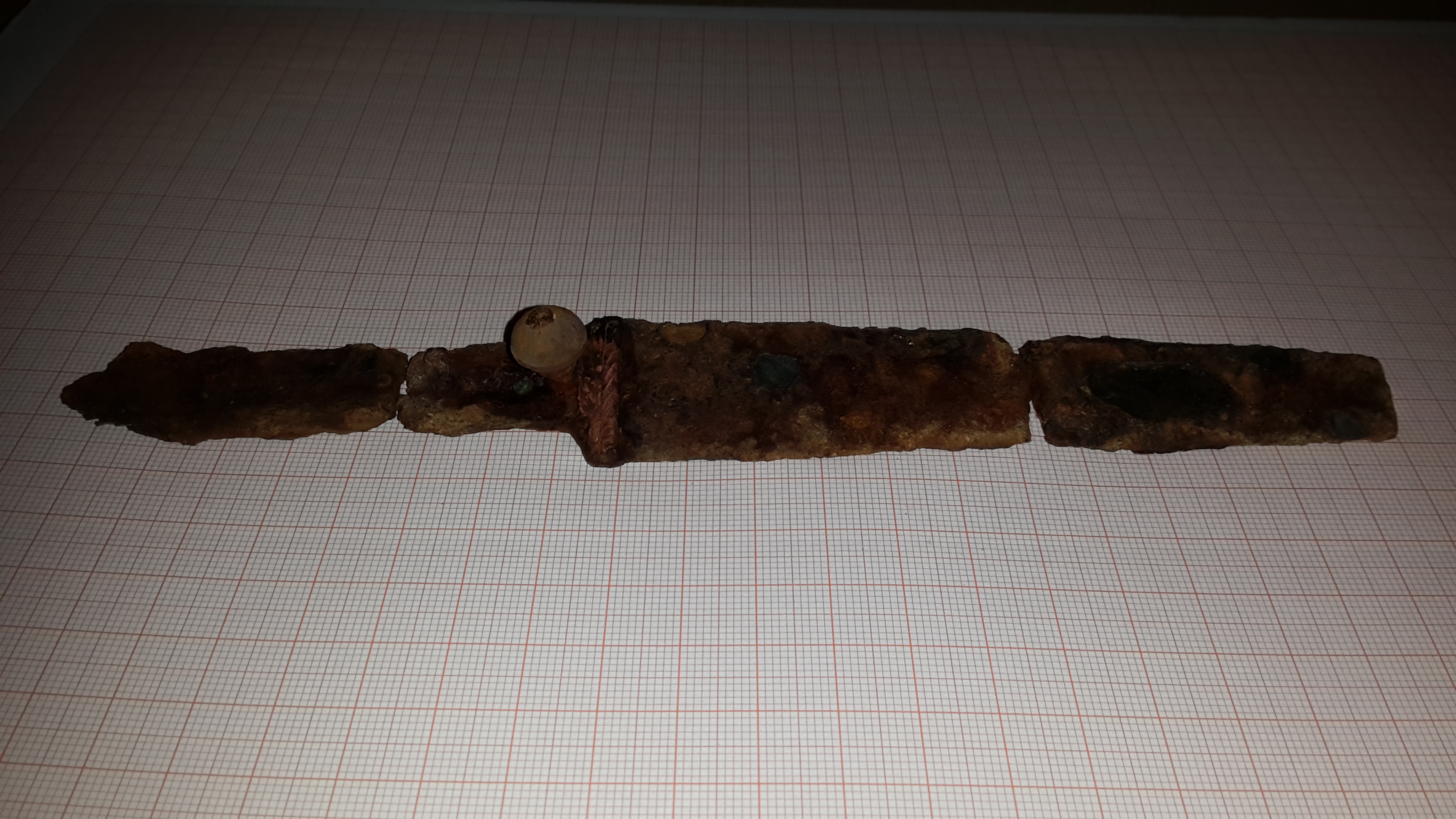 die Tage hat mir mein Suchhund einen Dolch unbekannter Herkunft beschert. Markant ist der runde Bronzeknubbel sowie die Verzierungen um den Griff. Diese scheinen wohl auch aus Bronze oder Kupfer zu sein. Der Dolch ist in drei teile zerbrochen wobei ein viertes ( die spitze ) fehlt. Der Griff ist ebenfalls abgebrochen. Die Griffschalen wurden wohl mit drei Bronzenieten gehalten.
