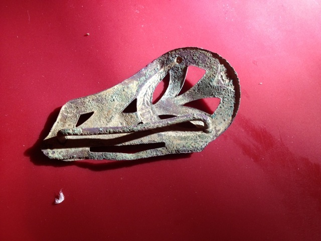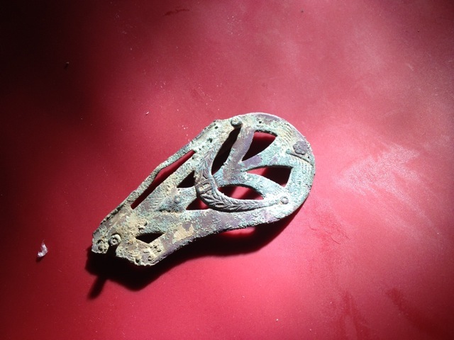 Eine Spange oder so etwas ähnliches , ein Bleiobjekt mit einer krickeligen 16 drauf.