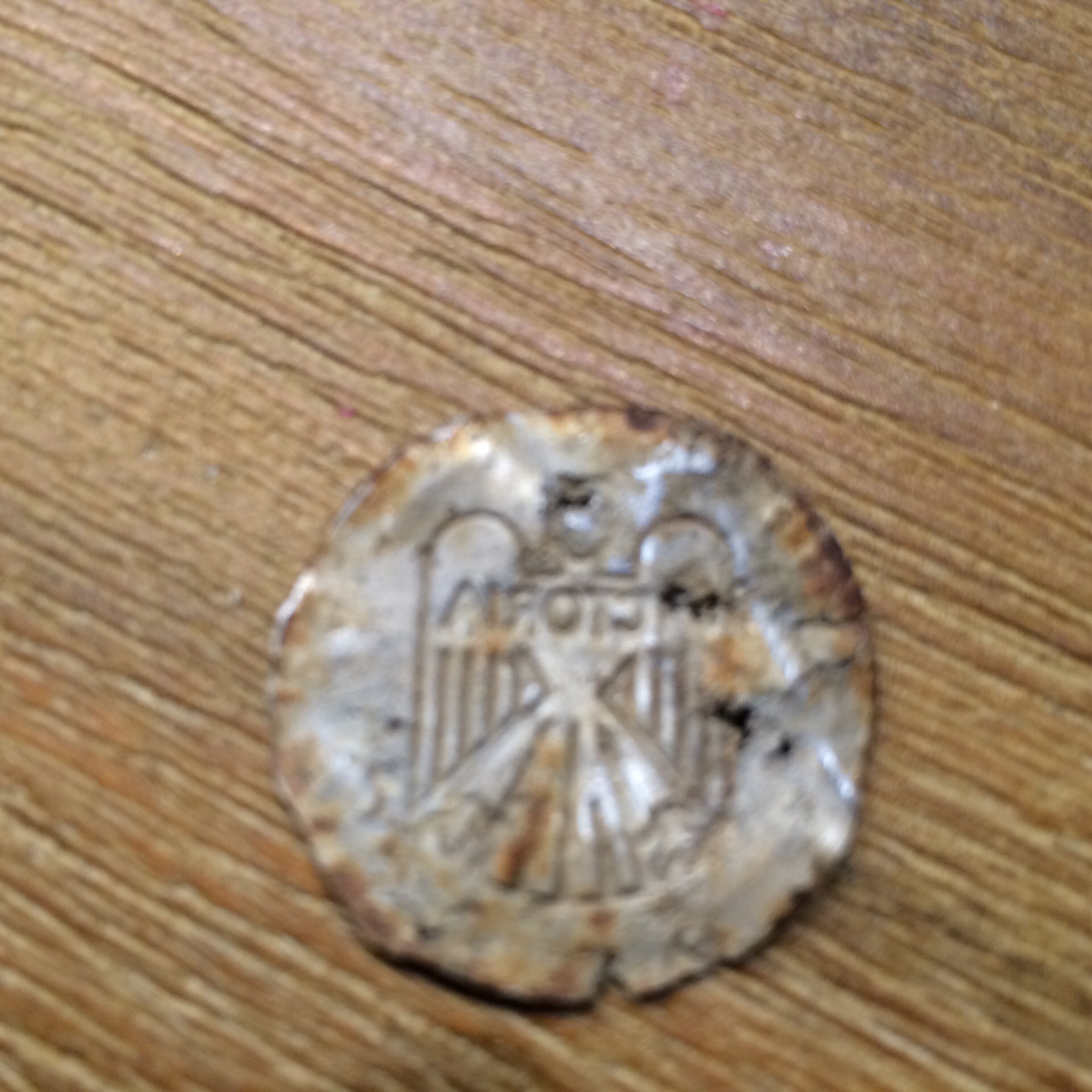 Es handelt sich um eine ziemlich dünne, leicht biegbare Münze bzw. Medaille, war als ich sie aus dem Boden holte geknickt. Ist wohl gestanzt (Rückseite = spiegelverkehrte Vorderseite), hat leider drei kleine Löcher. Abgebildet ist ein Adler mit der Inschrift Victoria, ohne Wert- oder Altersangabe. habe sie bisher nur notdürftig sauber gemacht, weil ich das Material noch nicht bestimmen konnte und nicht noch mehr an dem schönen Teil zerstören will.
