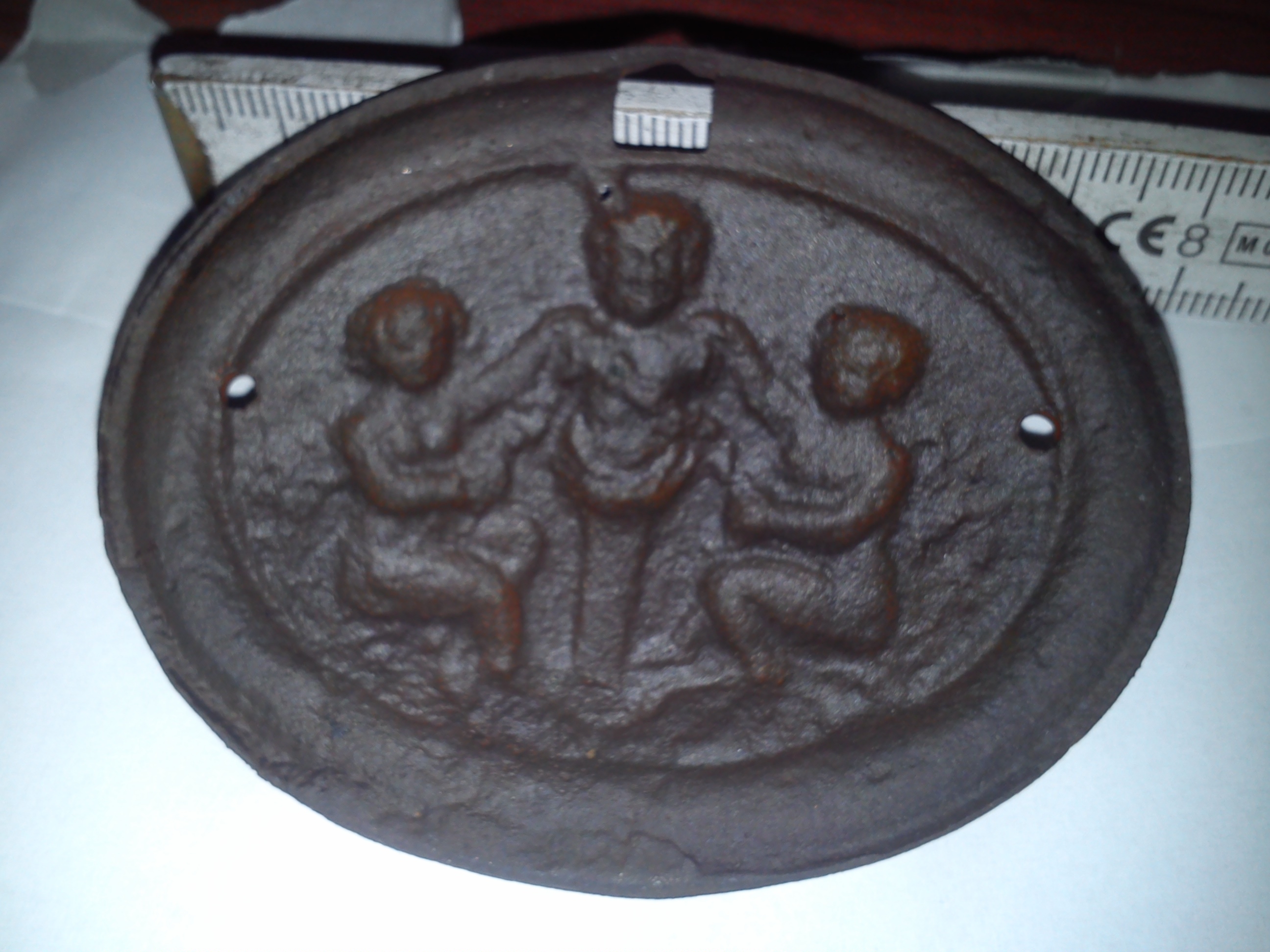 Vorderseite ist ein Neptun standbild das von 2 Kindern verehrt wird mit Teufelsfüßen/ bzw Hufe.
