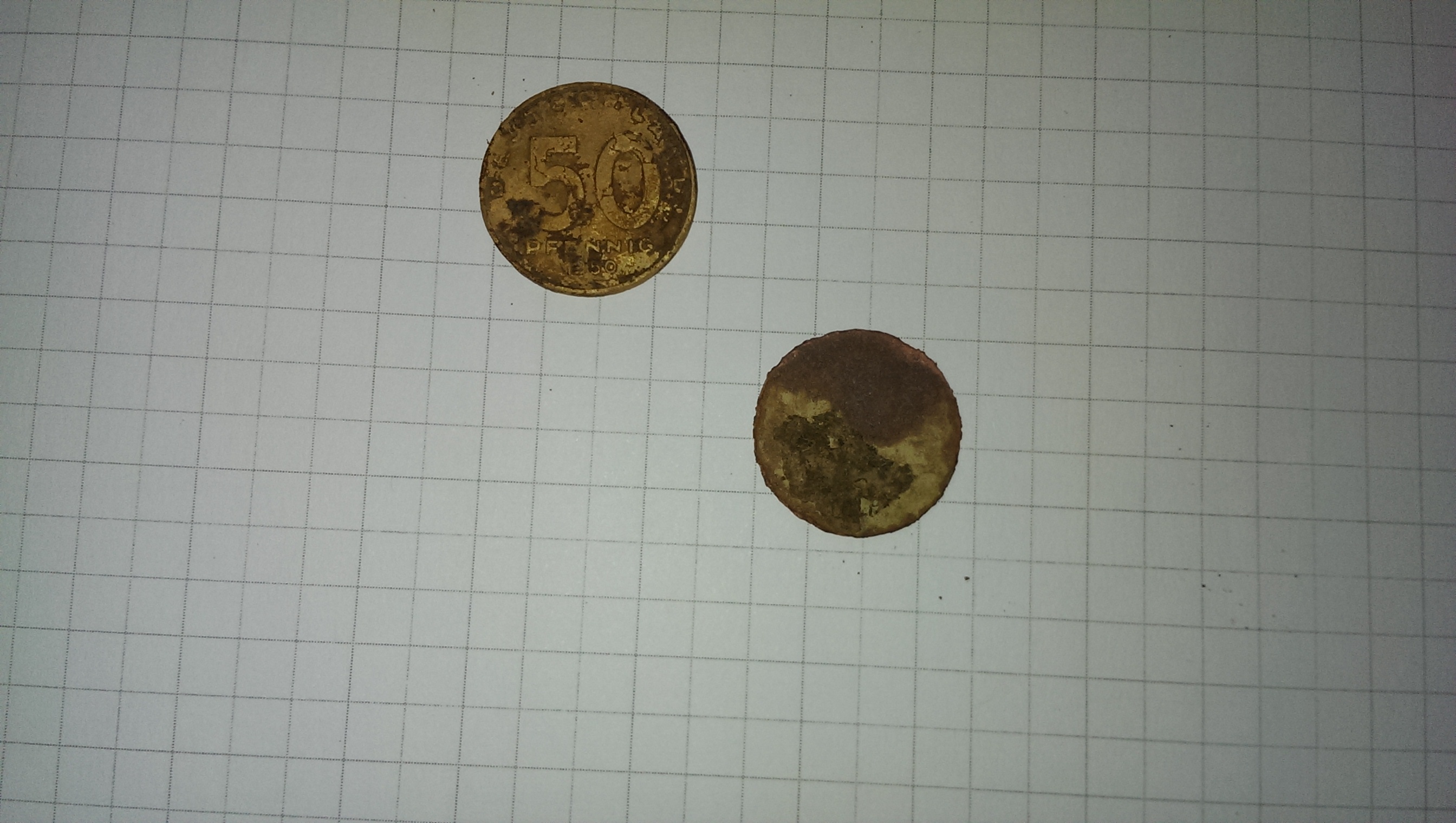 Jetzt zu meinem Sorgenkind: Auf den Bildern oben rechts dargestellt ist eine Münze, relativ klein und wahrscheinlich sehr alt. Die hat nur noch eine Höhe von <0,5 mm und hat starke Zerfallserscheinungen. Lesbar ist nur noch ein einziger Buchstaben "E". Material dürfte auch ne Legierung mit Kupferanteil sein. Wie rette ich das arme Ding ?