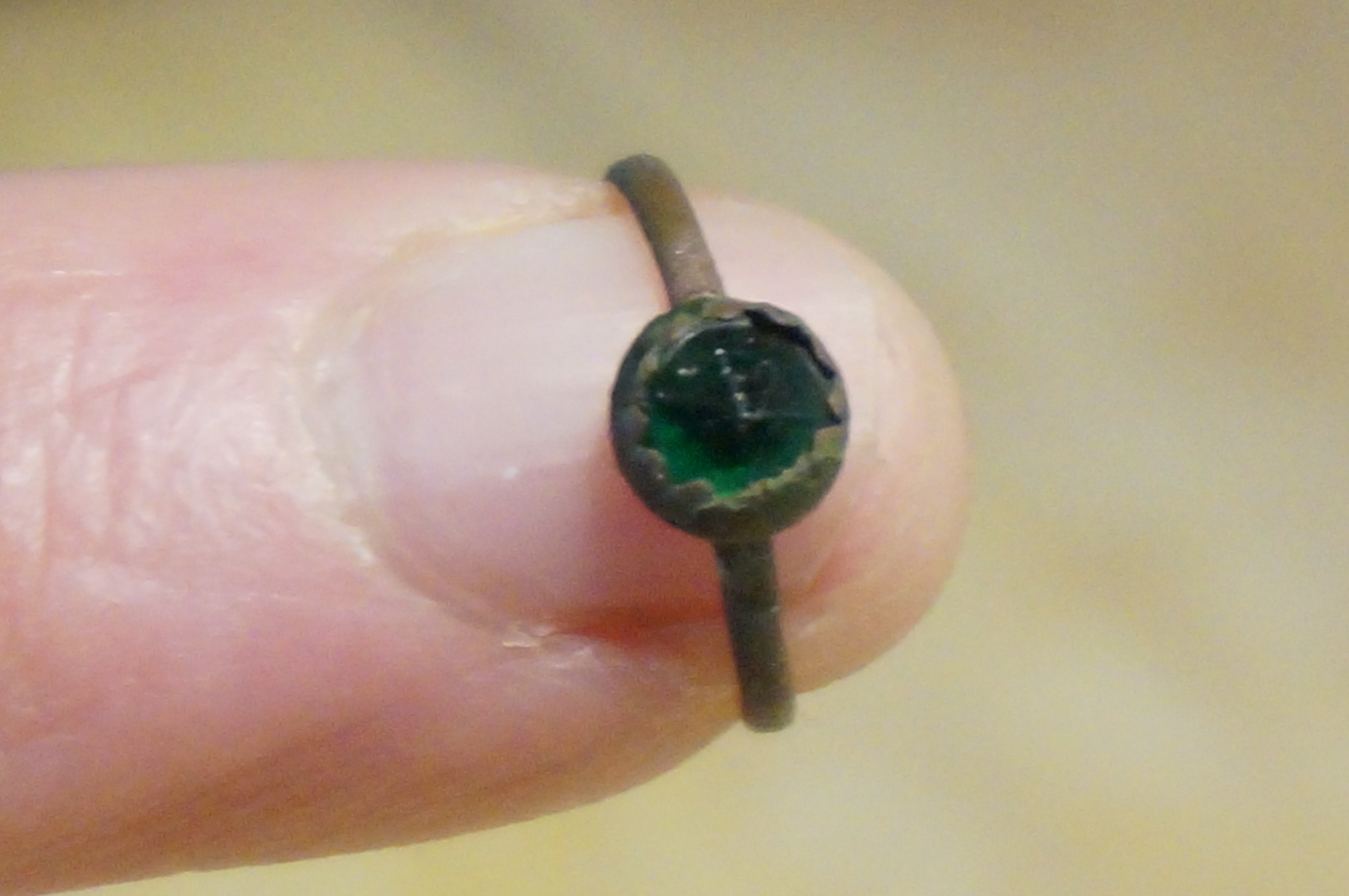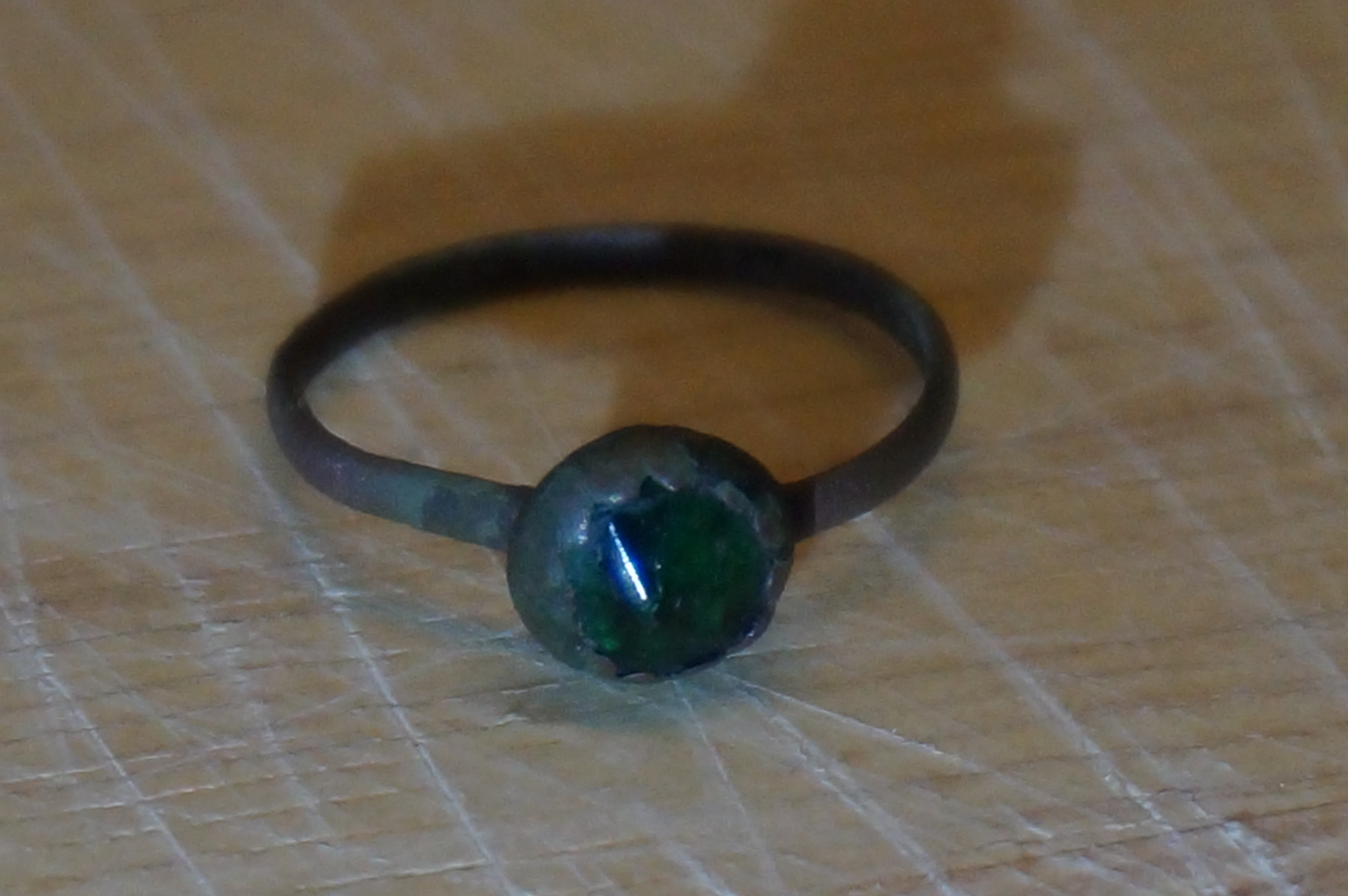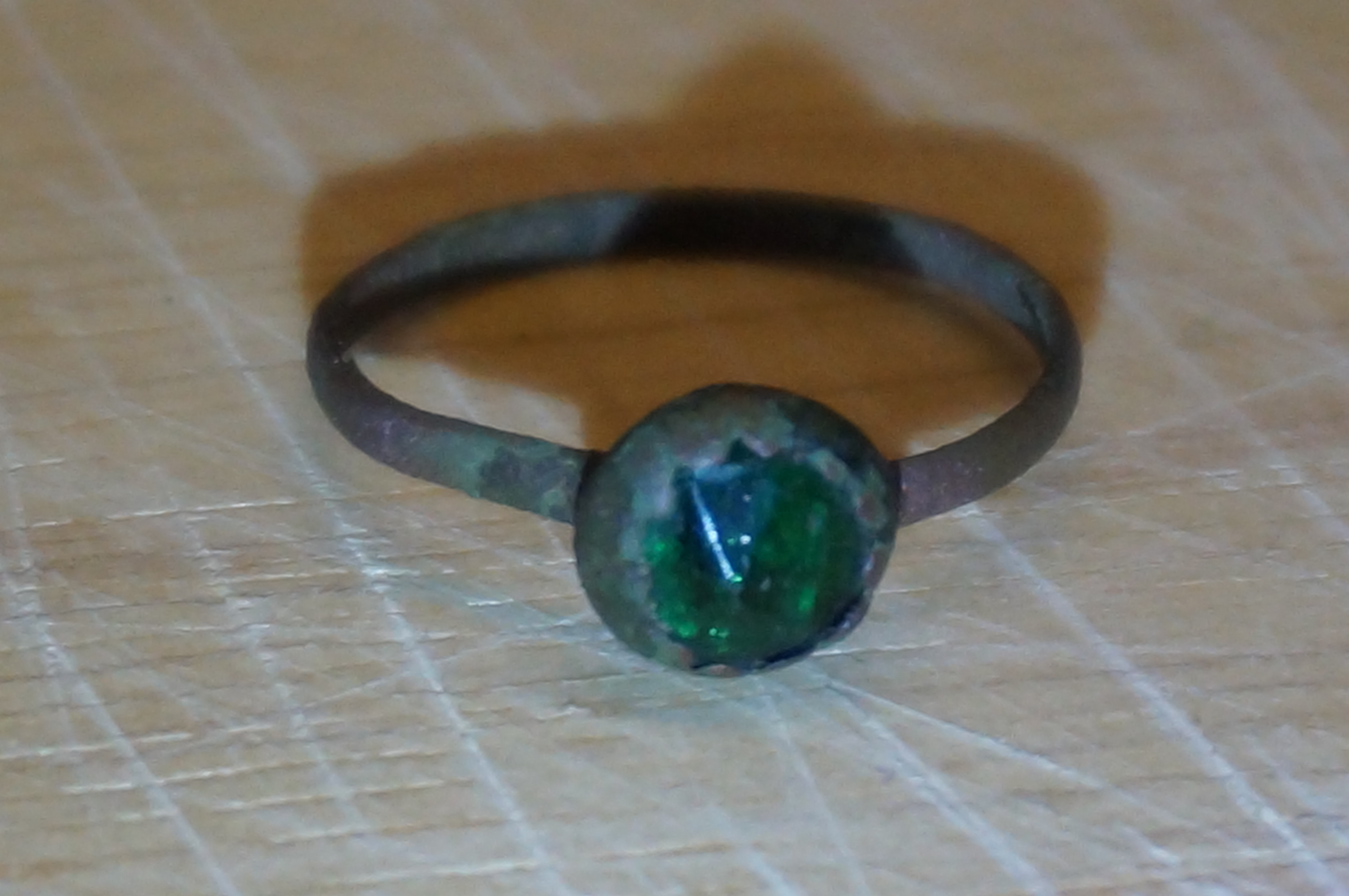 kleiner Ring mit grünem stein oder Glas ? Matterial ? lässt sich leicht biegen, Ackerfund . Denke mal das es sich um einen billigen kinderring handelt.