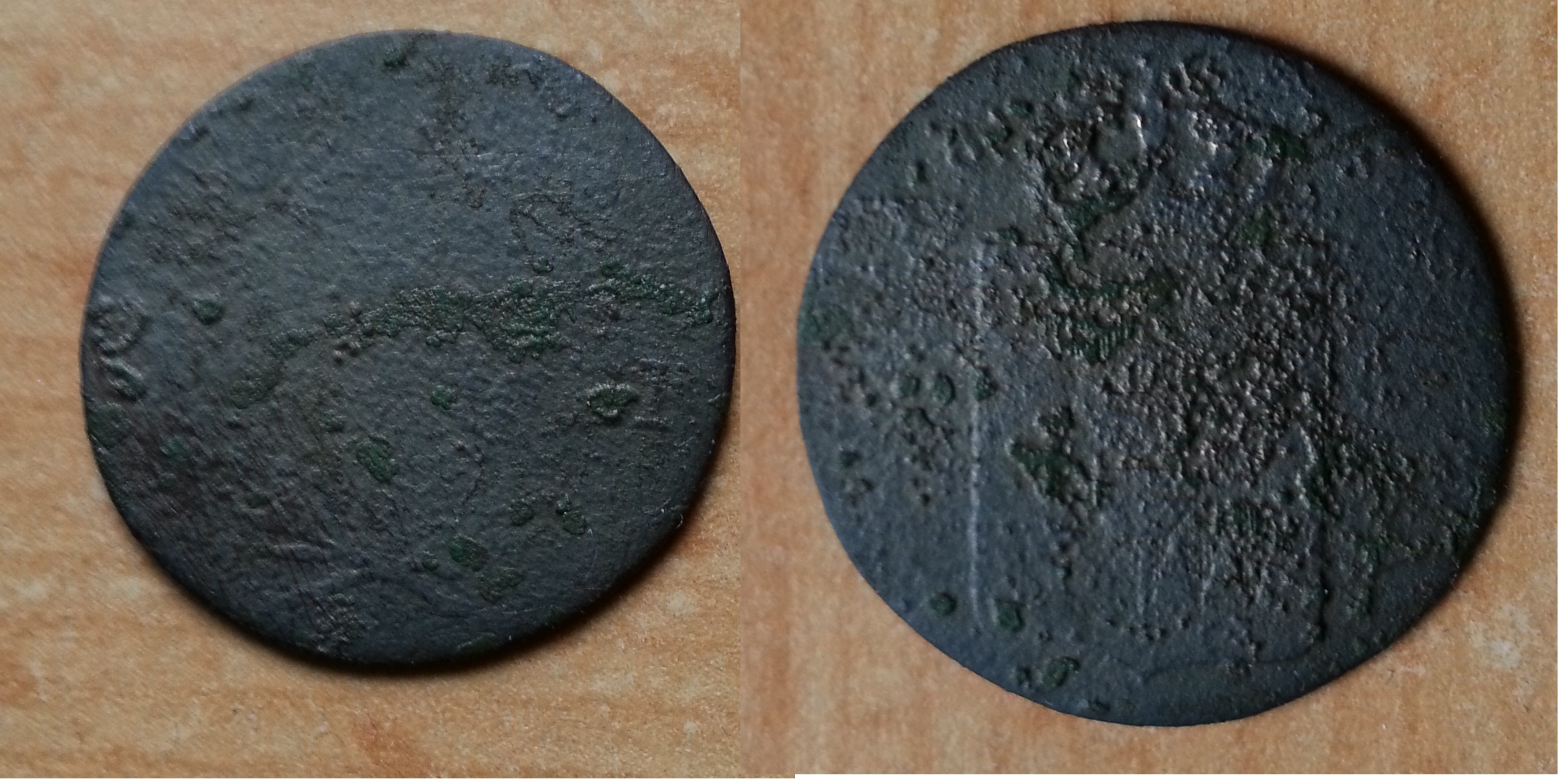 Auf der Vorderseite kann man unten noch den Rest eines Loorbeerkranzes? erkennen, rechts eine "1" oder ein "I".