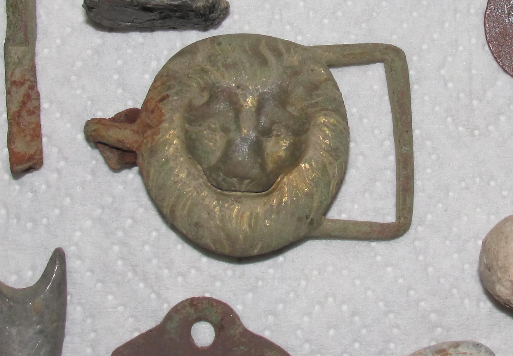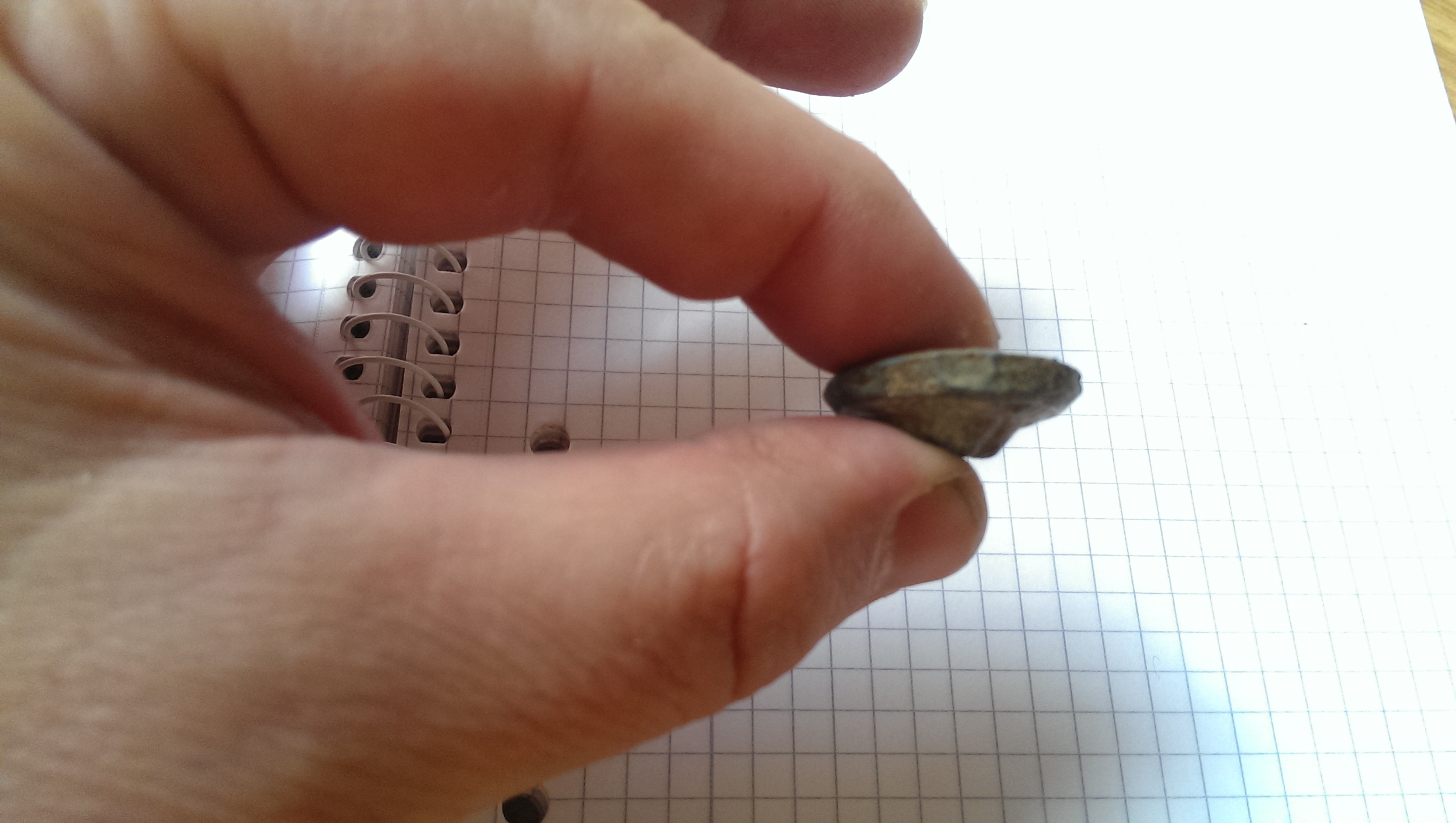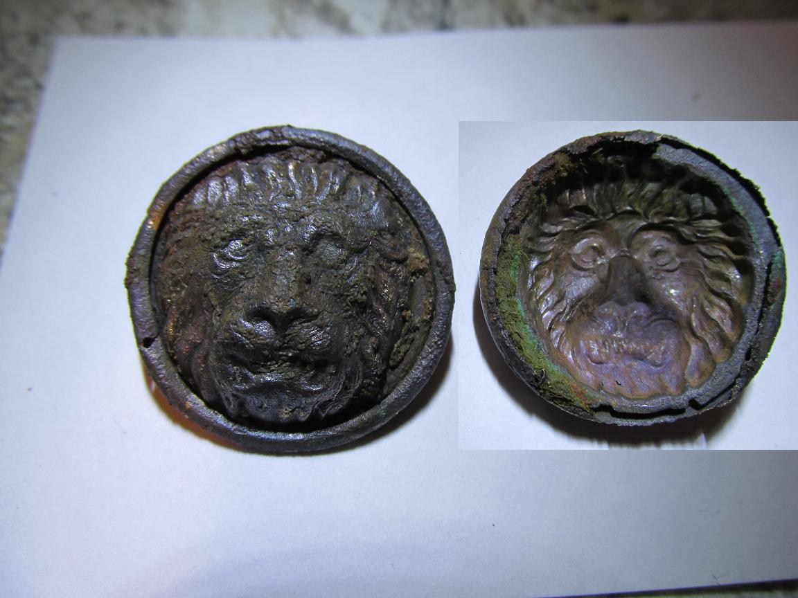 Auf einem Hohlweg habe ich diesen meiner Meinung nach "Löwenkopf" aus Blei gefunden. Für einen Knopf erscheint er mir etwas zu schwer.