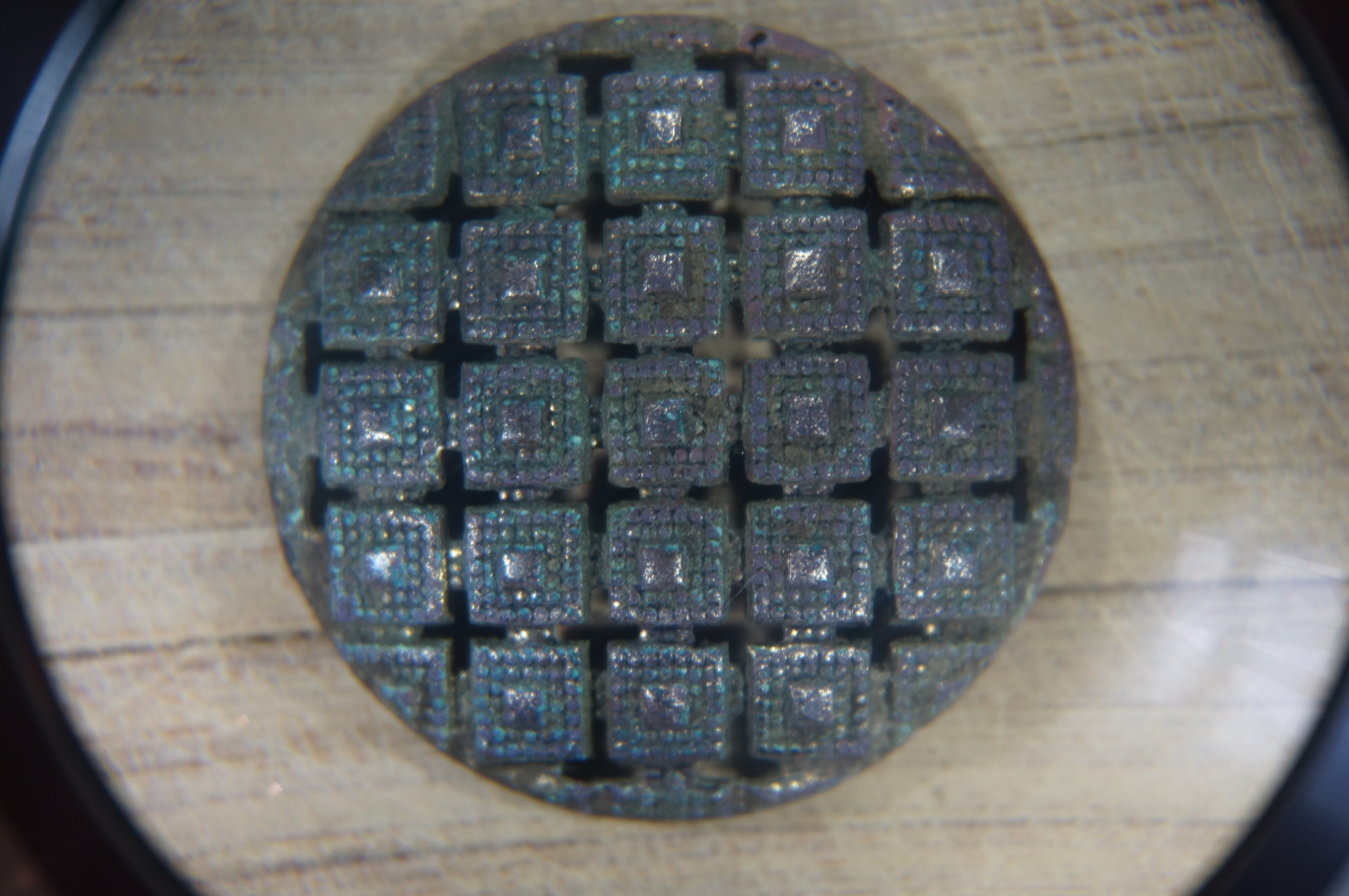 Waldfund.wollte es erst nicht zeigen,ein stück Metall.es hat aber was,vieleicht das muster.keine ahnung! was könnte das sein ? Durchm.45 mm . sehr leicht, 4,2g . war einmal vergoldet,ist zu sehen. Danke