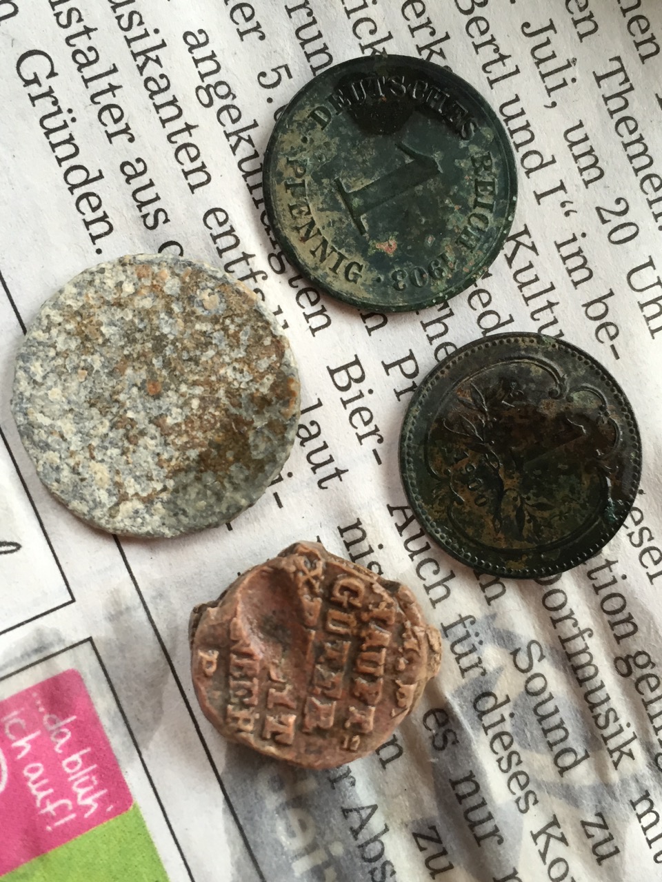 Danke für euere Hilfe. Das mit dem Fensterwirbel klingt gut. Heute war ich nun das 2. mal unterwegs. Wieder mal an der Donau. Außer Bleiklumpen von Fischern und Munitionsschrott war nichts weltbewegendes zu finden. Den Rest und unter anderem die 2 Reichspfennige habe ich in einem Waldstück gefunden. Die unidentifizierbare Münze habe ich aus der Donau geholt. Vermutlich ist es ein 5 Pfennig Stück.