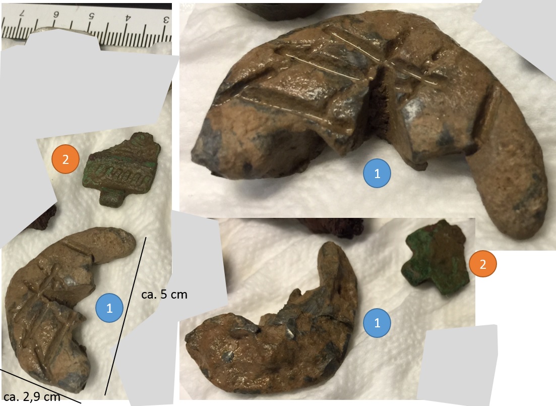 Fund Nr. 1 ist eine mondförmige Form (Größenangaben auf dem Bild) und weist Einritzungen auf. Fund Nr. 2 wurde in der Nähe vom ersten Fund gefunden. Sie gehören wohl beide nicht zusammen, dennoch stelle ich bei einmal hier ein.