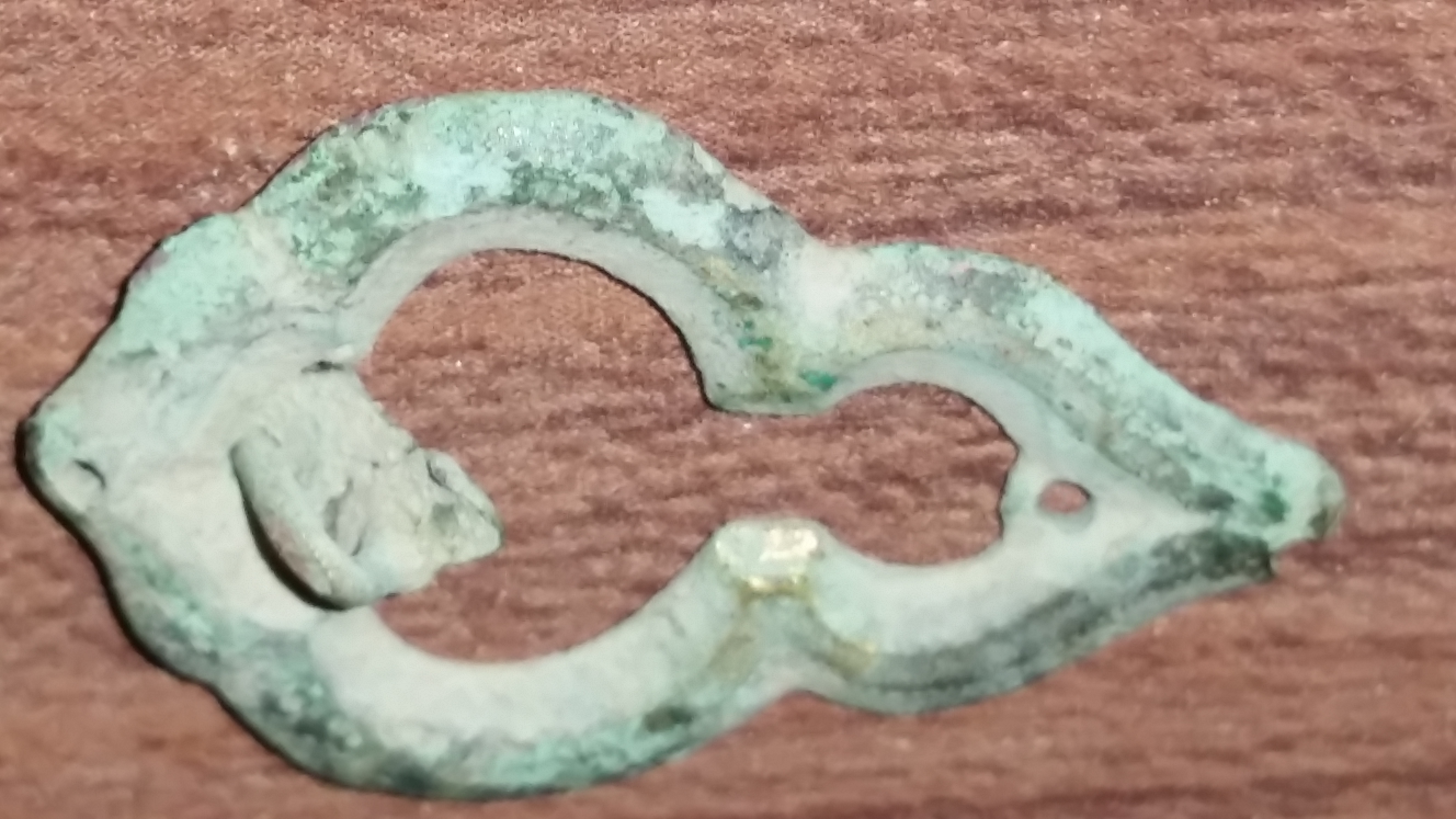 Hab dieses kleine Teil auf dem Acker gefunden. Leider kann ich es nicht zuordnen. Vielleicht eine Miederhaken? Es ist 2,5 cm lang und 1,5 cm breit.
