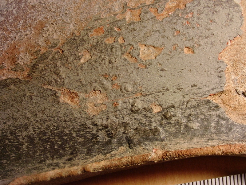 Gab einen klar definiertes, hohes NE-Signal, obwohl das Material eher schiefrig aussieht und bröckelig bricht. Das Gewicht liegt bei 54 Gramm. Es ist ein hell-bis dunkelgrauer Farbauftrag zu sehen.