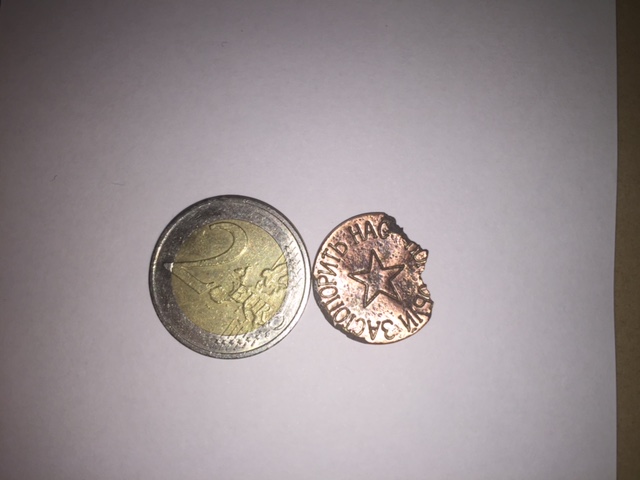Sprache würde ich sagen Russisch / D = 22 mm / Dicke ca 2-3 mm/ auf der Rückseite ist nichts zu erkännen ( fehlt die Beschichtung )