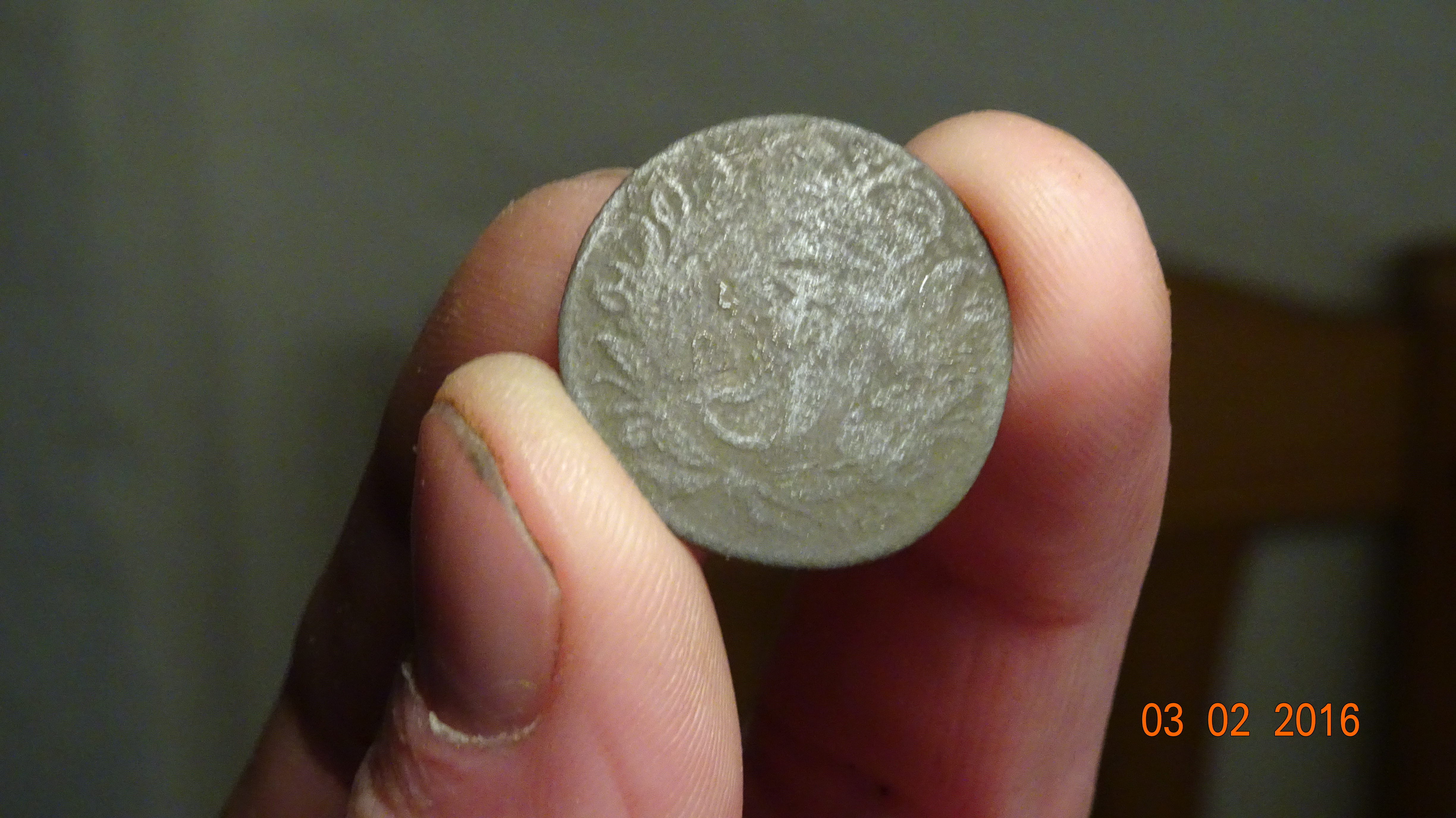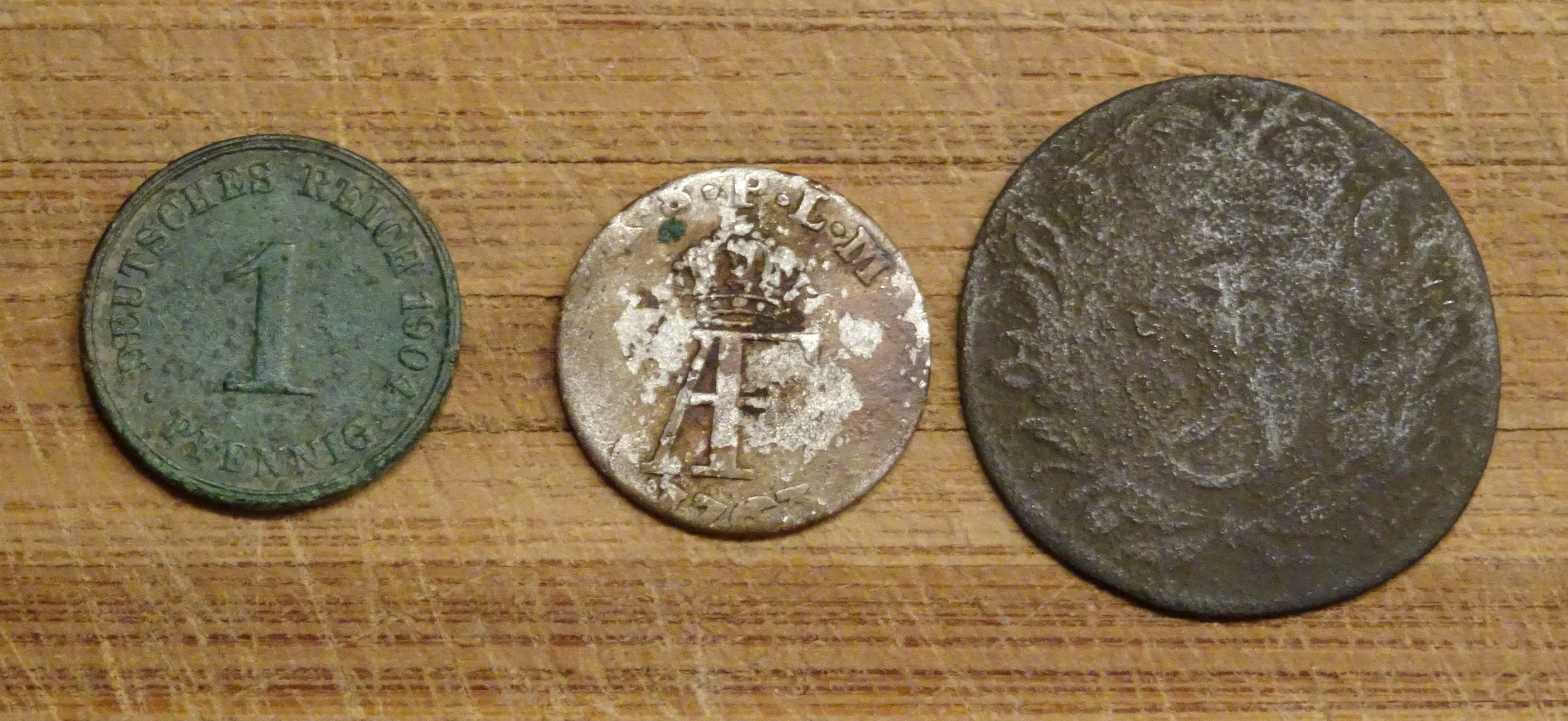 Grüße :winken: Schöner Fund :thumbup Keine Schrift zu erkennen nur ein Wappen ich denk mehr an eine Medaille (Orden) oder an einen Knopf denn auf Rückseite ist gar nix zu erkennen schade und auch immer Ärgerlich. Dafür ist der sechser sehr schön und der Kaiserpfennig ist auch super. Was für ein Buchstabe hat der Pfennig :?: Ist unten an den Krallen vom Adler 2X rechts und links