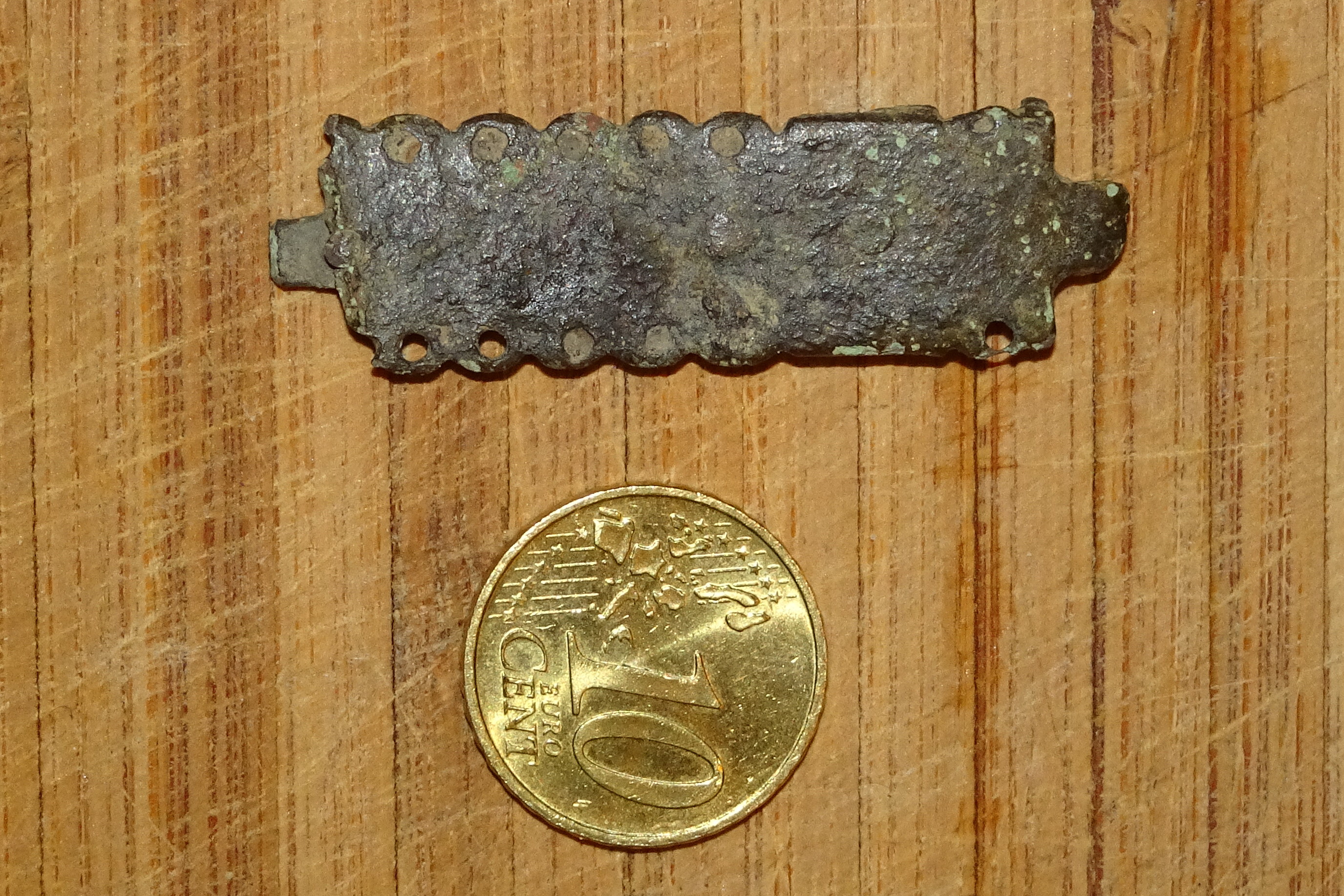 Und das verzierte Kupferteil könnte entweder von einem Segmentgürtel stammen , oder einer Buchschliesse .
