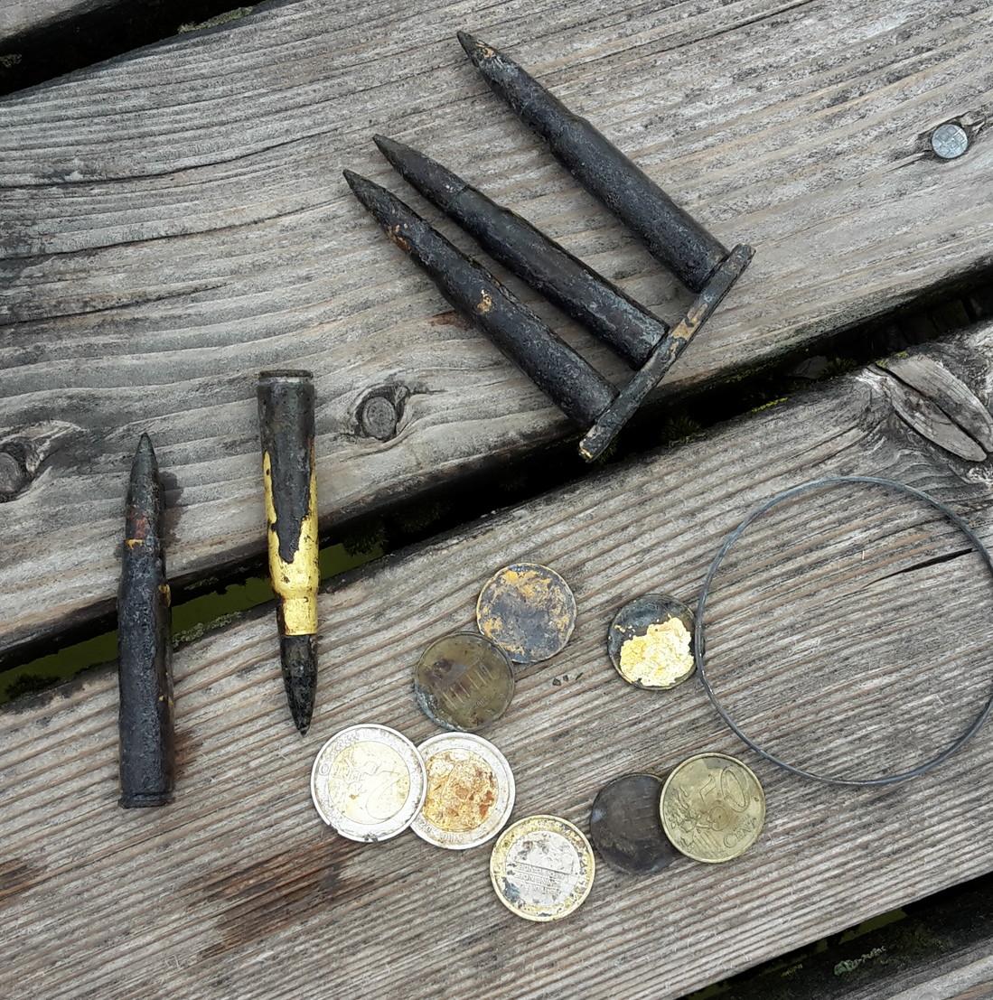 Damero hat geschrieben:Hallo, war heute eine Stunde im seichten wasser am Badesee. Auf dem Foto das Ergebnis. Die Euros geb ich gerne aus. Aber was mach ich mit der Munition...? (aus WK2?) Falls die noch scharf ist will ich die nicht rum liegen haben und Mülltonne scheidet wohl auch aus. Polizei? Aber will nicht registriert werden und Fragen beantworten. Also am besten in die Mitte rudern und wieder ins Wasser?