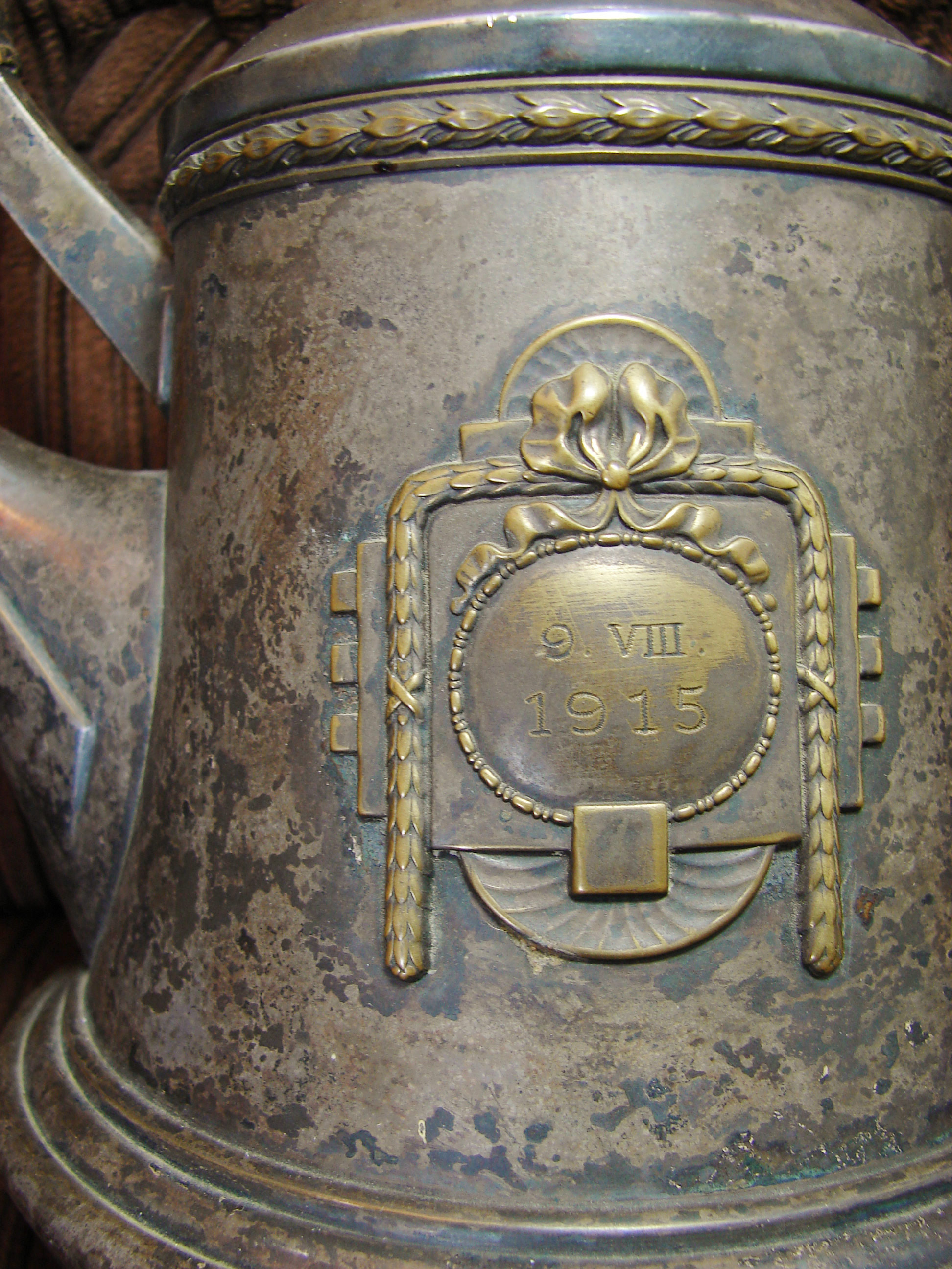 Es handelt sich um eine (anscheinend) versilberte Kanne mit Griff aus Elfenbein oder Horn (?) und der Aufschrift