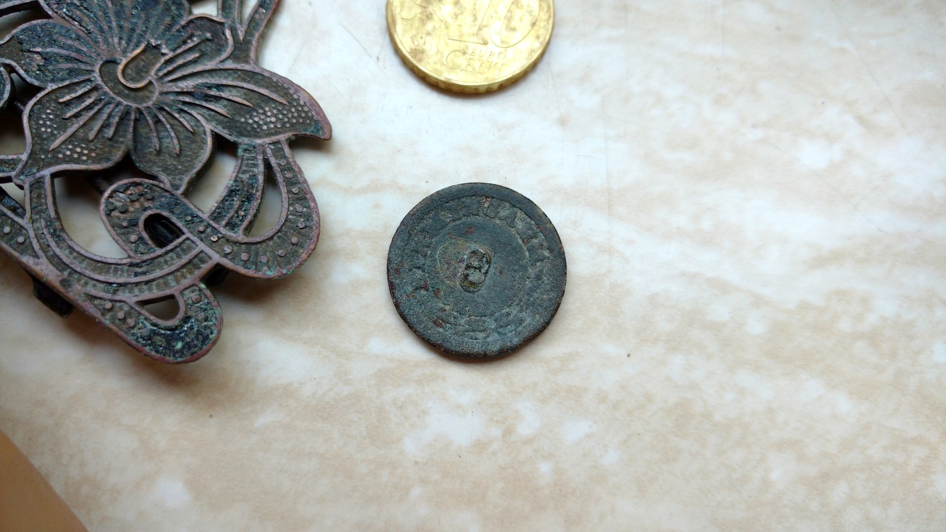 Bild 3:Knopf mit Inschrift, vorne blank, für mich zu erkennen sind folgende Buchstaben: BIRMINGA.HM !BITTE UM BESTIMMUNG!