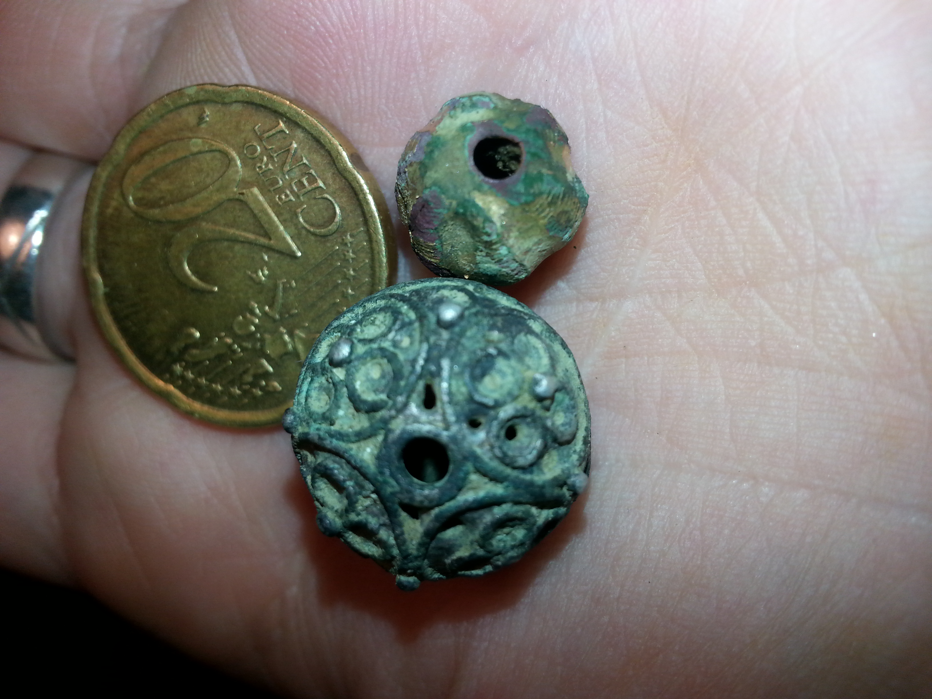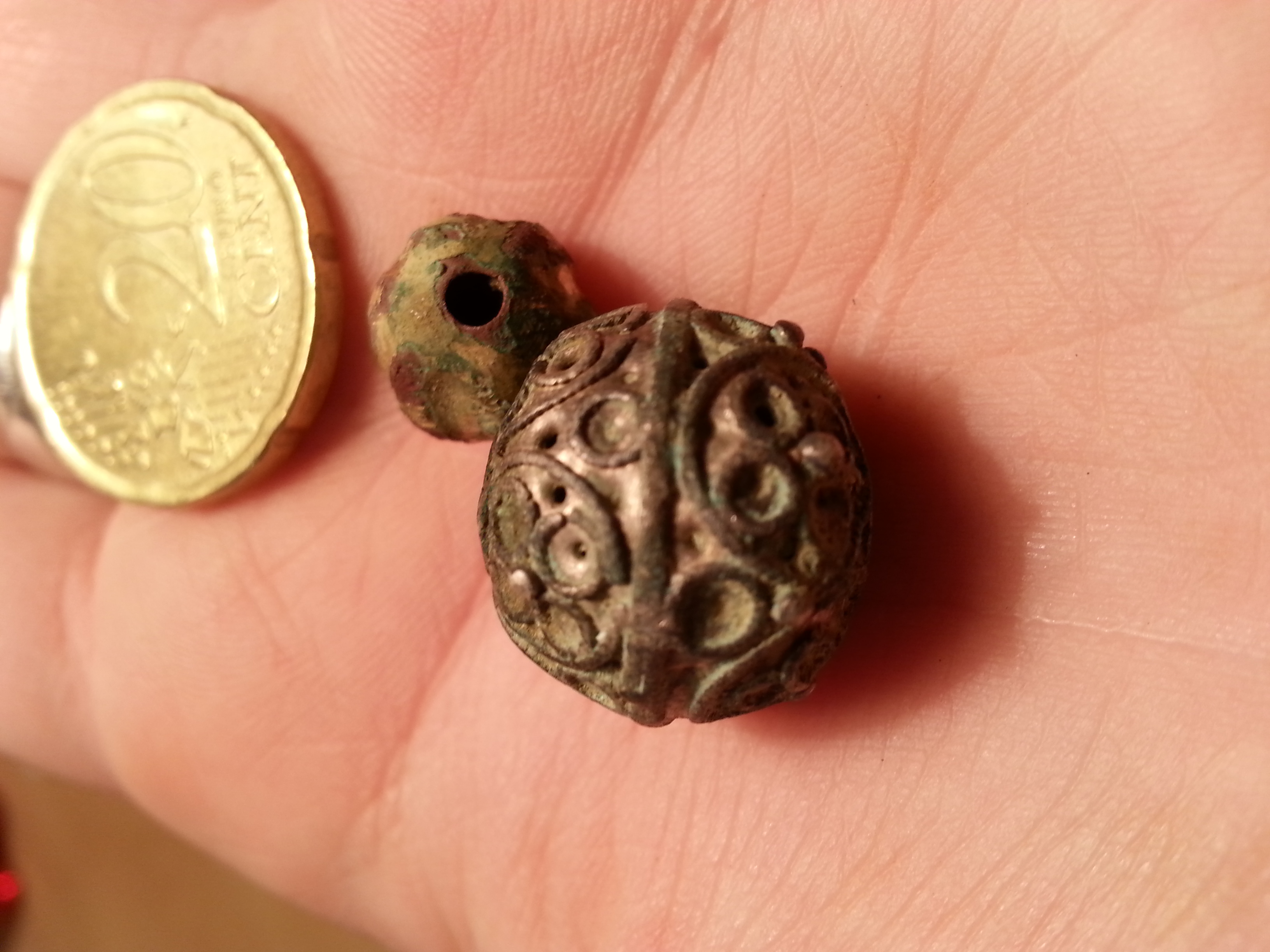 heute waren auch diese beiden Kugeln/Perlen dabei. Sie sind sehr leicht. Beide innen hohl und haben ein Loch auf beiden Seiten. Die größere schimmert Silber mit grüner Patina und hat relativ gradlinige Löcher. Die kleinere hat verschiedene Farben und schimmert golden. Sie hatte versetzte Löcher.