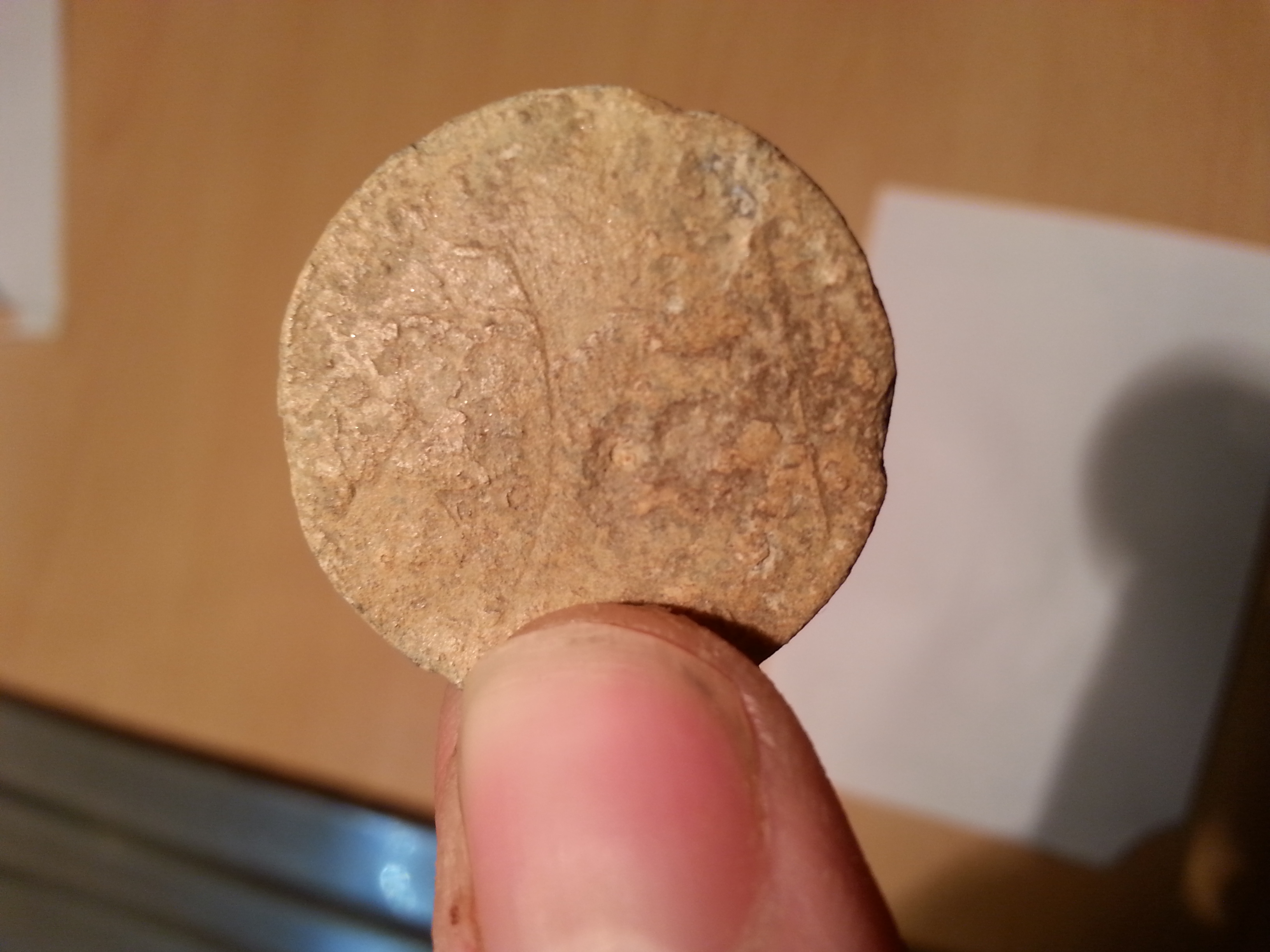 Bild 3+4 Zinkmünze, Vorderseite: 20 zu lesen, Rückseite: vermutlich Person mit Boot? Größer wie 20 Cent Münze