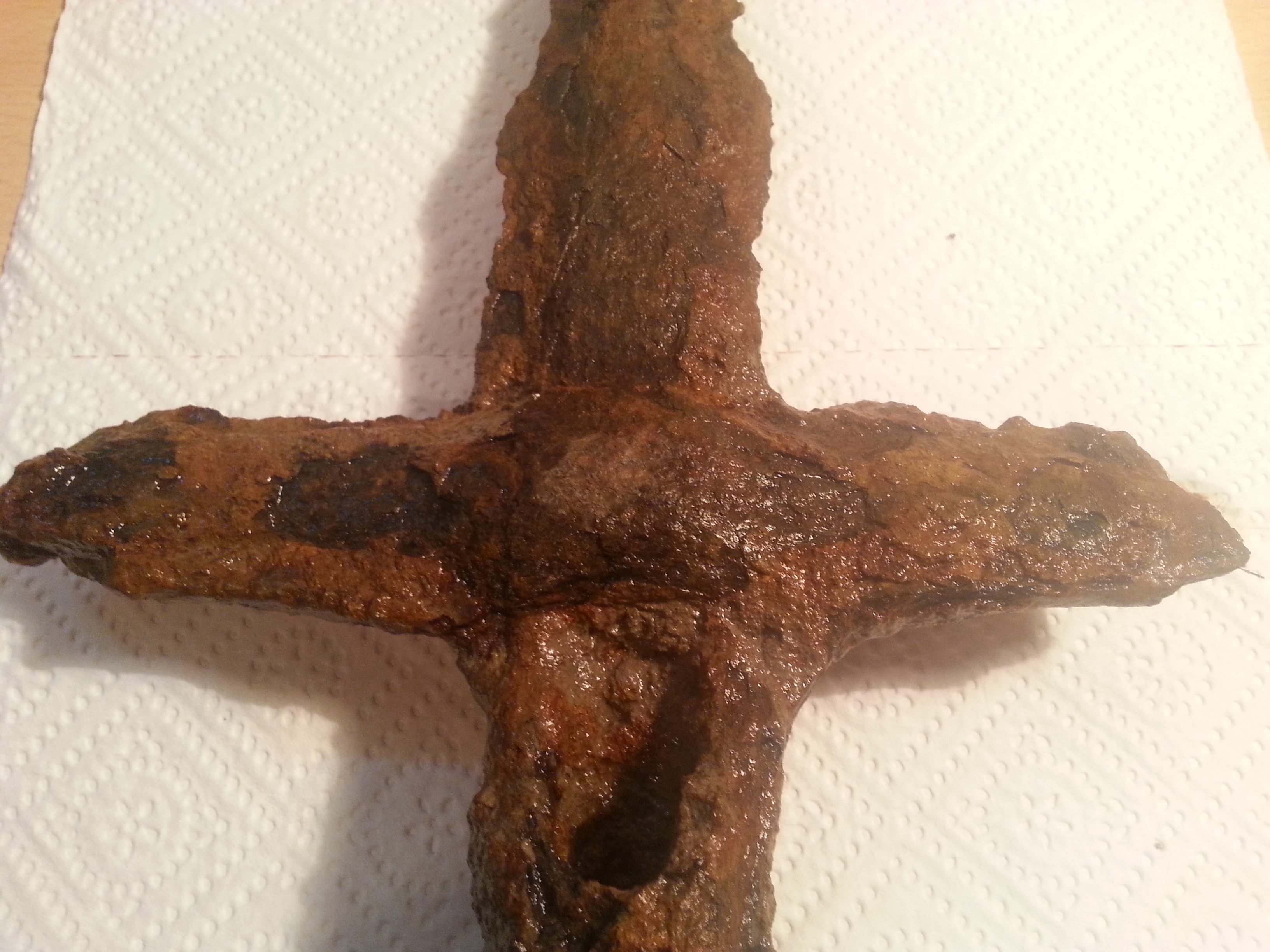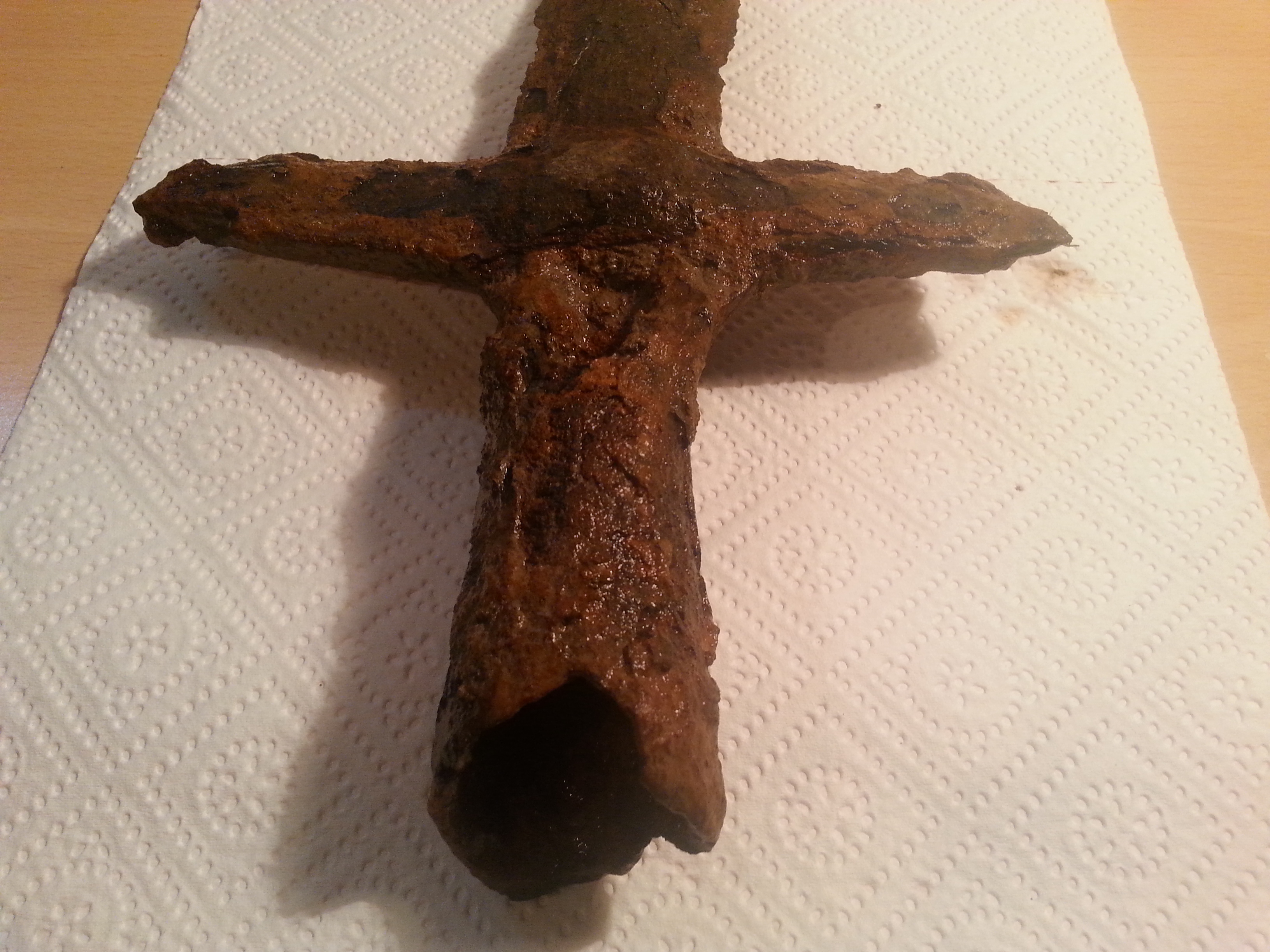kann jemand sagen was das sein könnte? Es ist 35 cm lang und 20 cm breit und natürlich aus Eisen. Es war wohl an einem Holzstab befestigt. Weitere Funde waren eine Gürtelschnalle, Musketenkugeln und so weiter nichts besonderes. Oberhalb der Wiese befindet sich eine "Bauernschanze", welche aber nicht als rotes Gebiet markiert ist. Passt das zeitlich?
