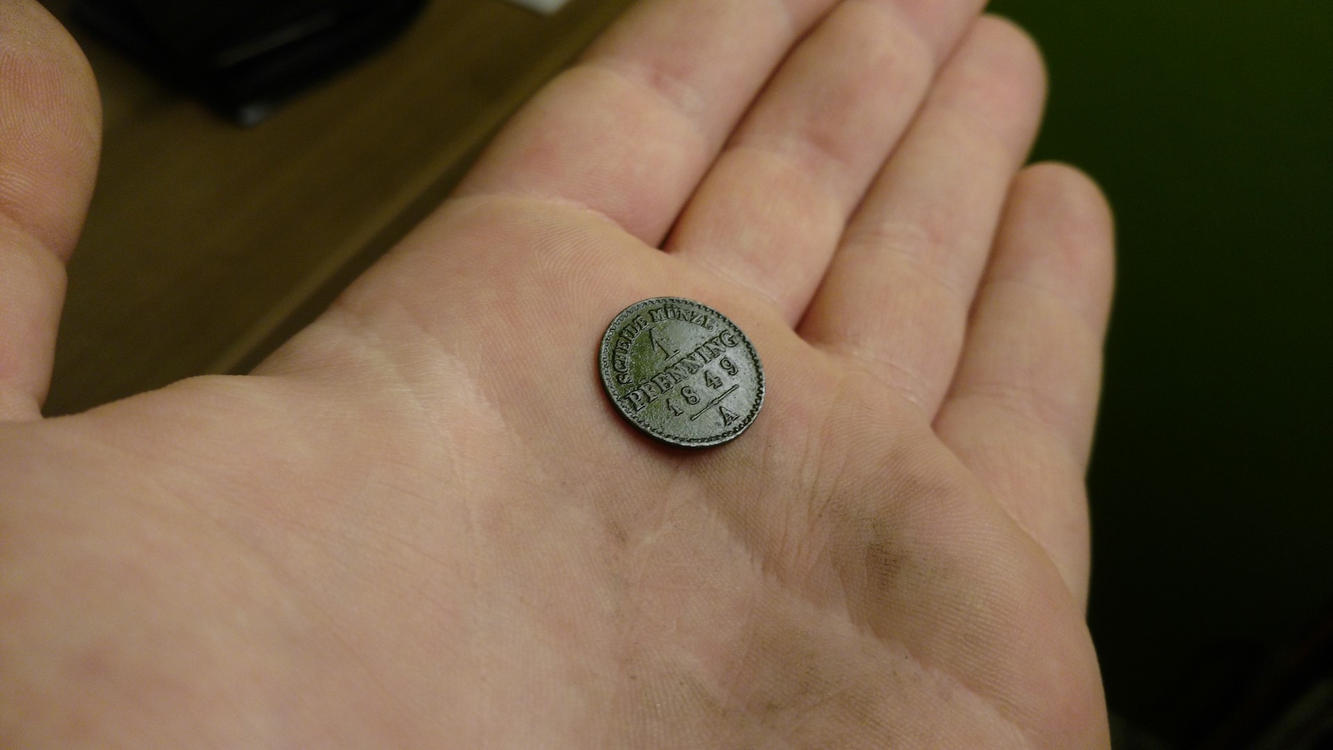 Ich verfolgte den Weg ein paar Meter und fannd auf dieser Strecke alle 3 Münzen, eine Bleiplombe von "Vitello Margarine", nen Knopf und am Wegesrand das ASB Abzeichen.