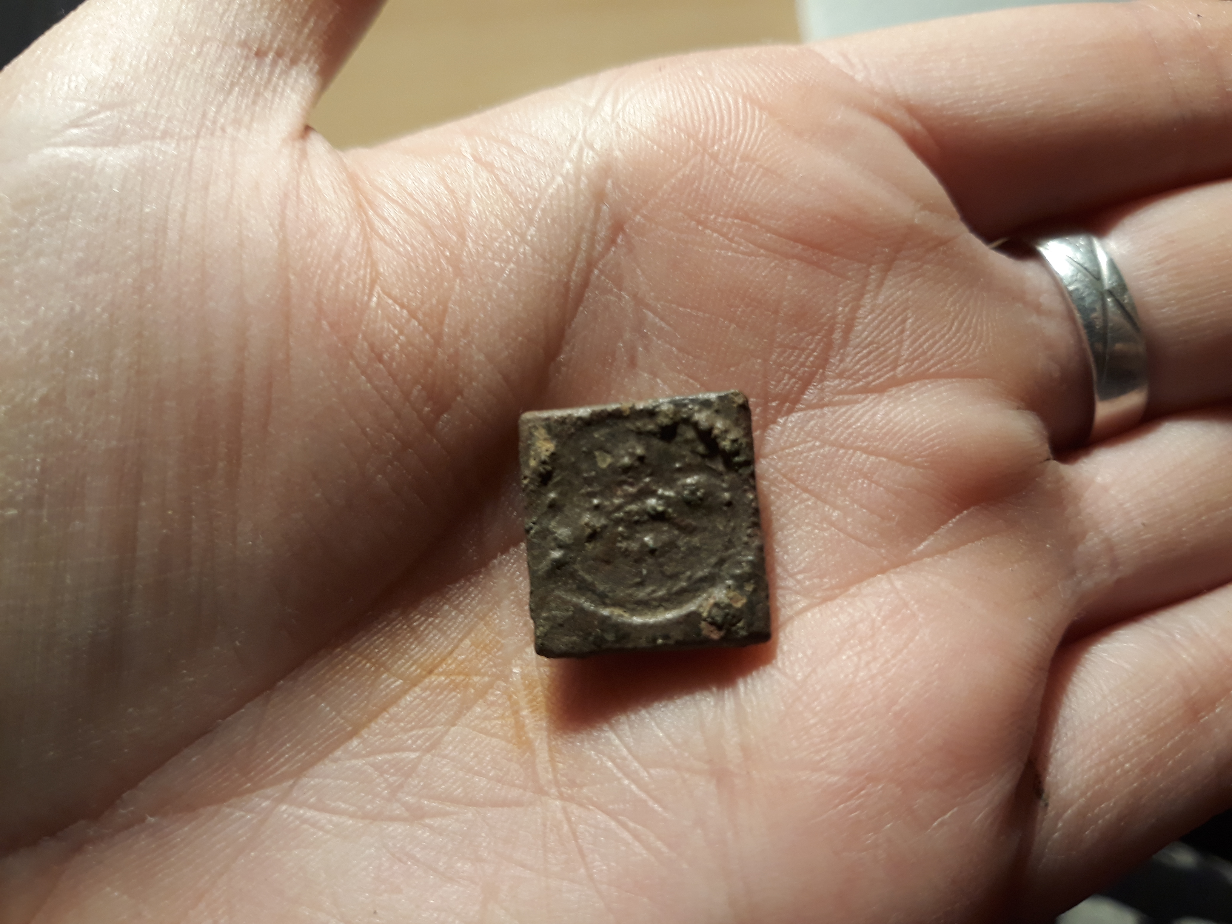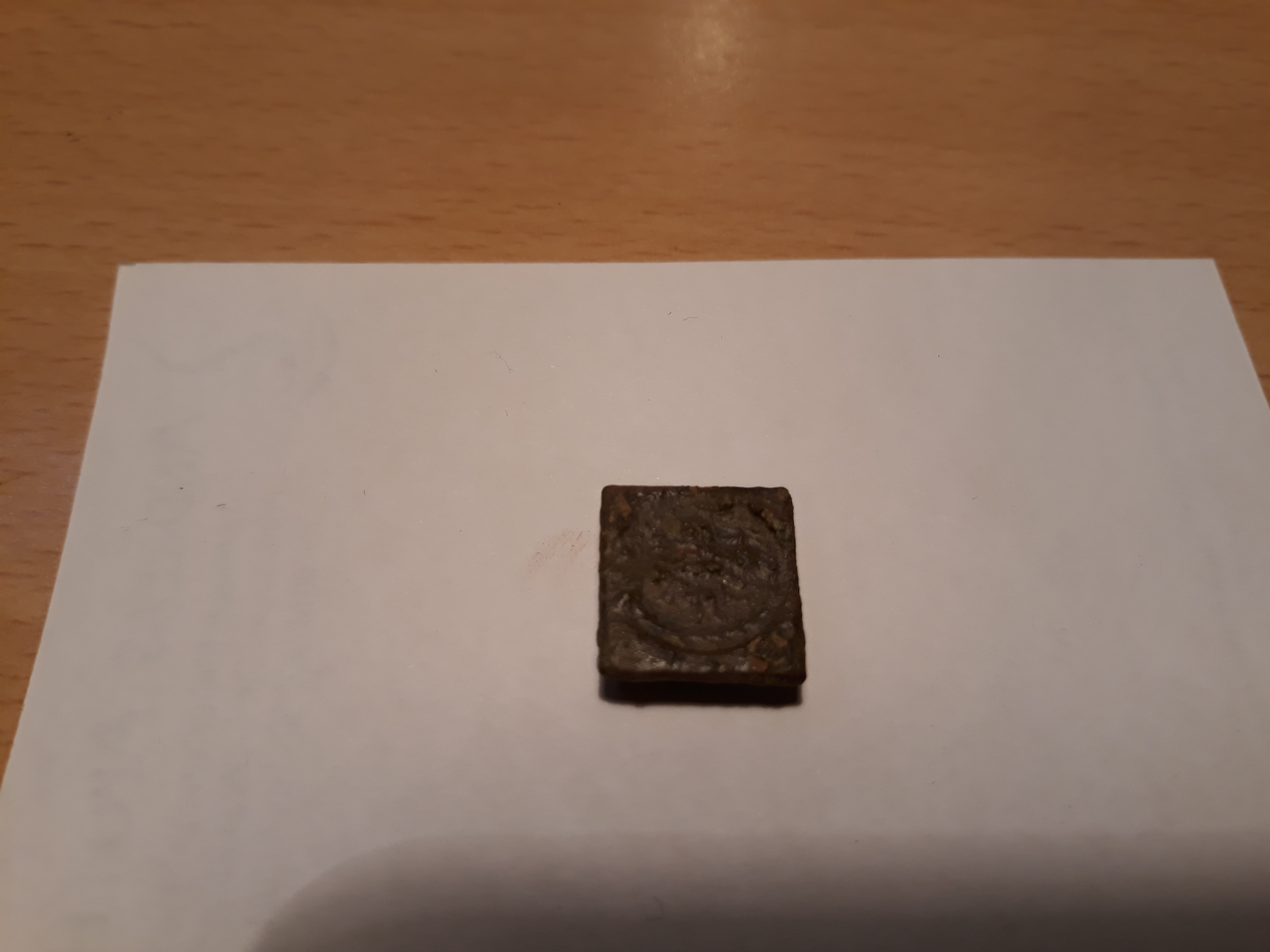 Leider kann man auf diesem nicht mehr viel erkennen. Es wiegt 6 g und ist aus Kupfer. Vorderseite: eine Person in einem Kreis. Es ist klippenförmig und die Rückseite ist komplett blank.