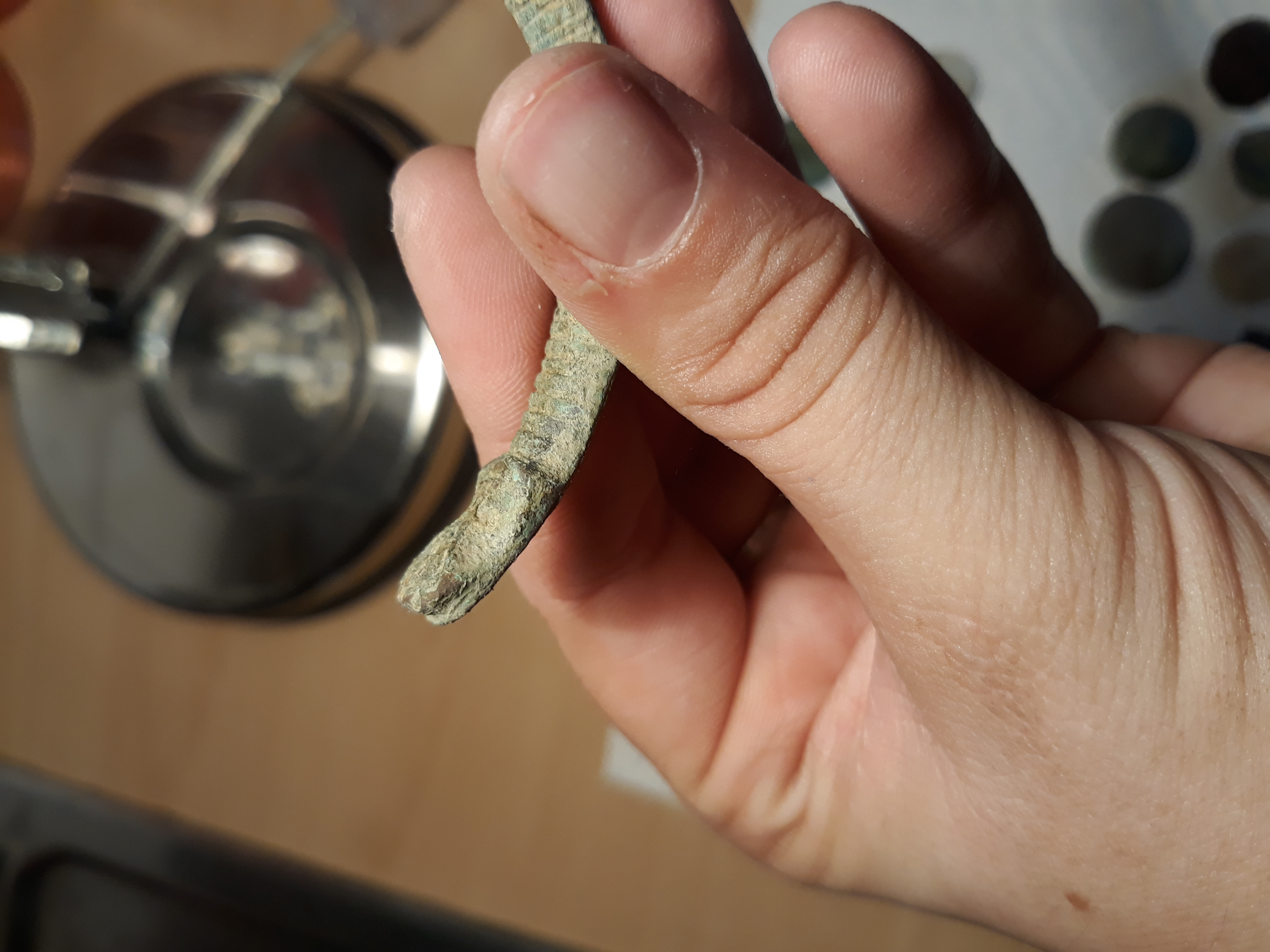 auch war gestern etwas sehr schönes und vermutlich altes dabei. Es hat vorne einen Tierkopf (vermutlich Schlange oder Drache), ist verziert mit Rillen und hat am hinteren Ende zwei unregelmäßige Löcher. Sehr stark gebogen und die Rückseite ist blank. Von der Farbe her, ist es die gleiche wie ein Trensenteil aus der Hallstattzeit, was wir ganz am Anfang gefunden hatten in einem anderem Gebiet. Länge ist etwa 10 cm und Breite 1,5 cm.