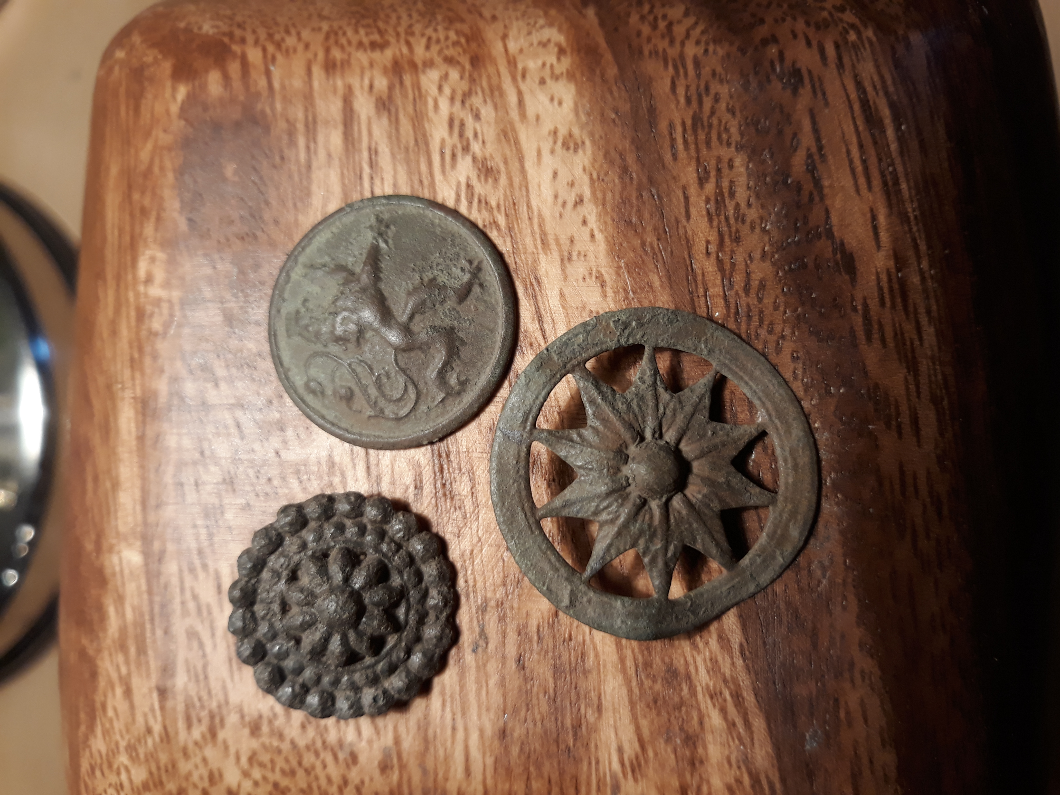 Jemand eine Ahnung was das rätselhafte Bleiobjekt mit den vielen Spitzen sein könnte. Etwa 3,5 cm groß. Und dann noch die die Zink (?) Medaille. Auf der Vorderseite eine Person mit sehr hervorstehenden Augenbrauen, nach rechts blickend. Rückseite ein Lorbeerkranz mit Kreuz (?) innen? Durchmesser etwa 5 cm. Dachte zuerst es könnte ein schlechter Römer sein. Aber denk es gibt keine Römermünzen in der Art???