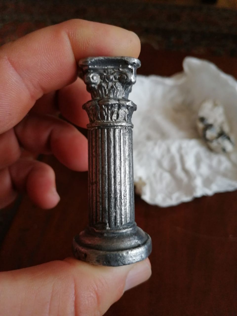 Kann es nicht richtig zuordnen. Entweder sieht man eine griechische bzw. römische Säule aus Metall, einen Soldaten, die noch halb in einer Art Gussform steckt. Dann eine Bronzemünze.