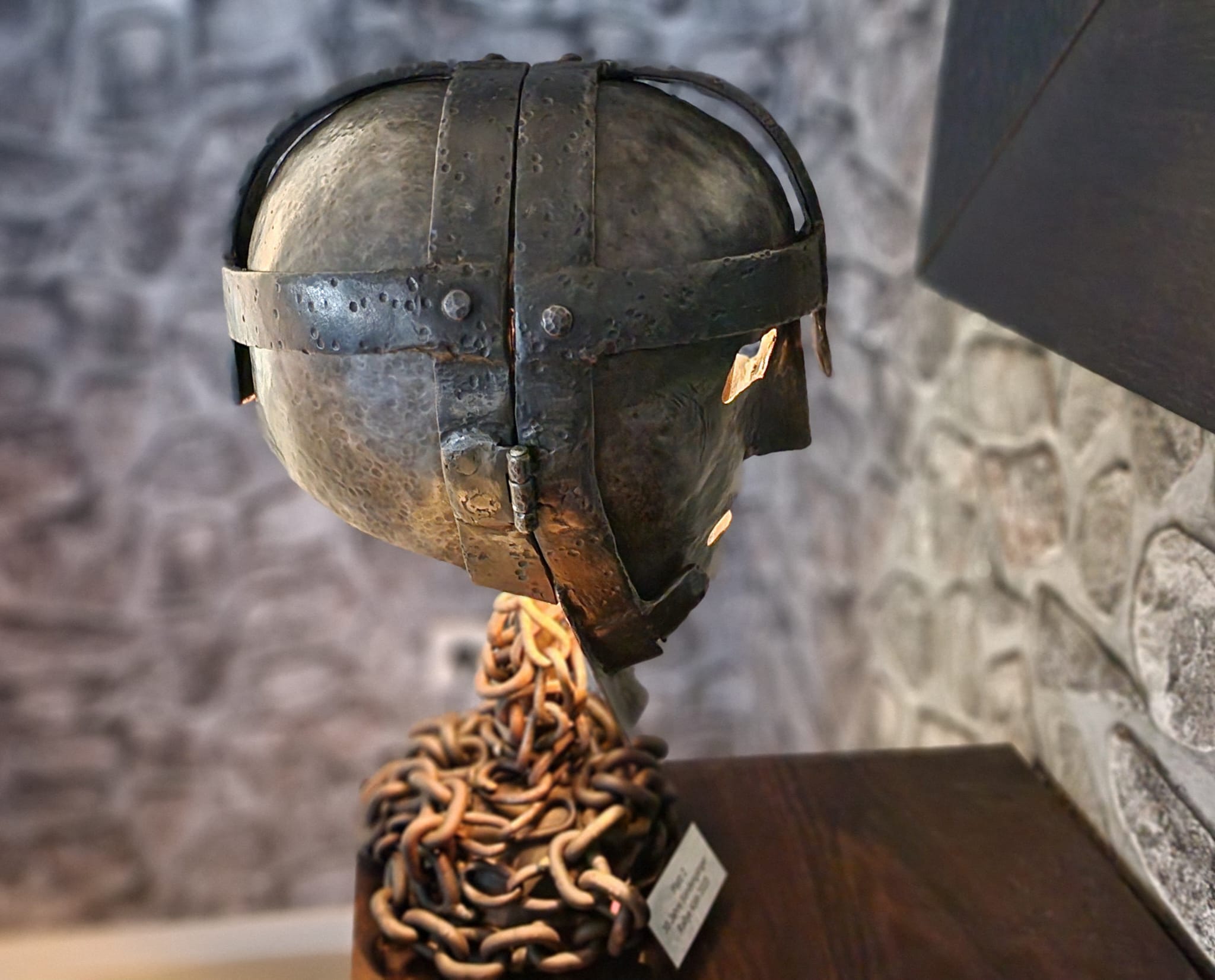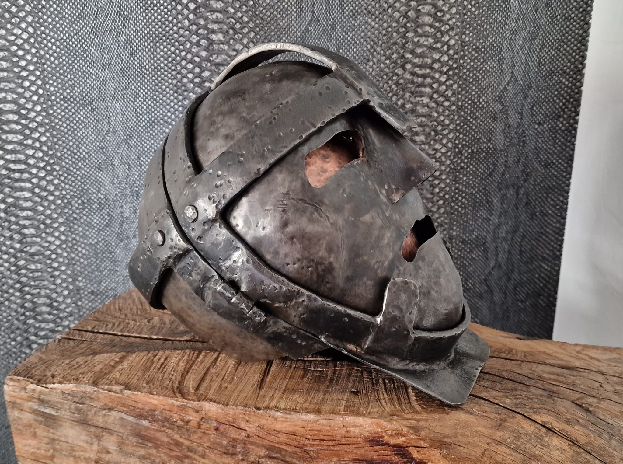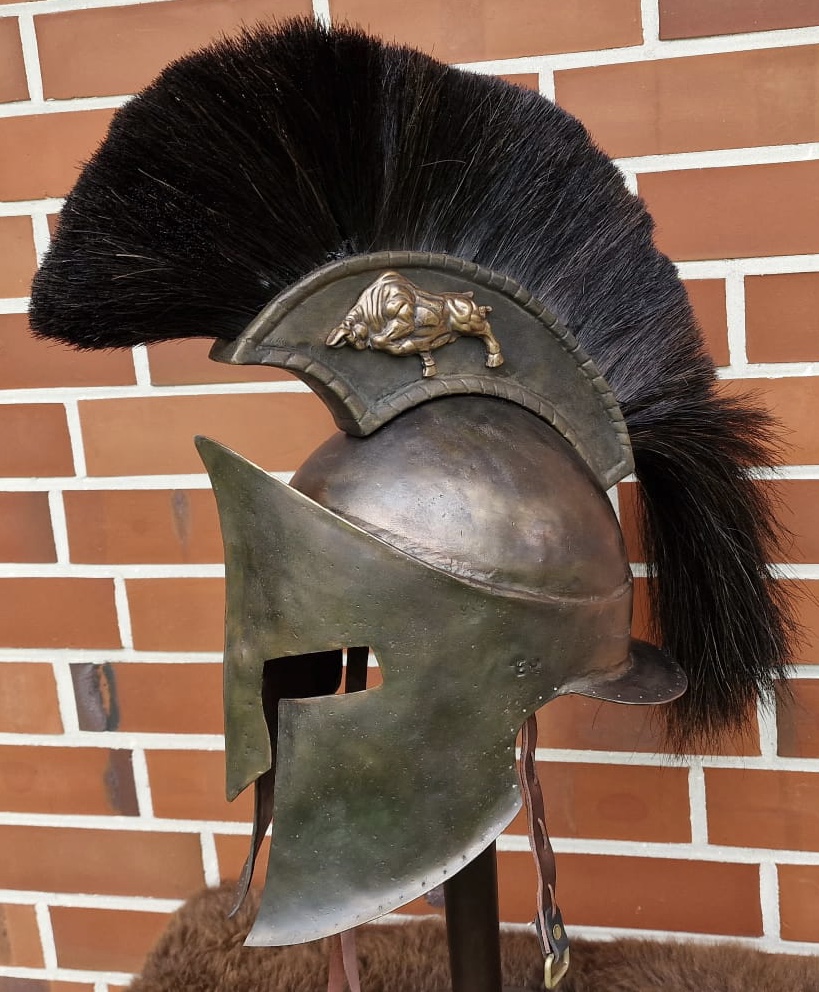 Canis Derechte Lupus (Ernst) hat wirklich beeindruckend meisterliche Arbeit abgeliefert. Der Sparta Helm besteht aus robustem Stahlblech und wurde aus 9 Einzelteilen verschweißt, um eine solide Konstruktion zu gewährleisten. Die beiden Stierapplikationen, die aus Bronze gegossen wurden, verleihen dem Helm sicherlich eine imposante Optik. Die Verwendung von Pferdehaaren fügt dem Helm eine interessante texturale Note hinzu. Die patinierte Blechoberfläche verleiht dem Helm einen antiken Charme.