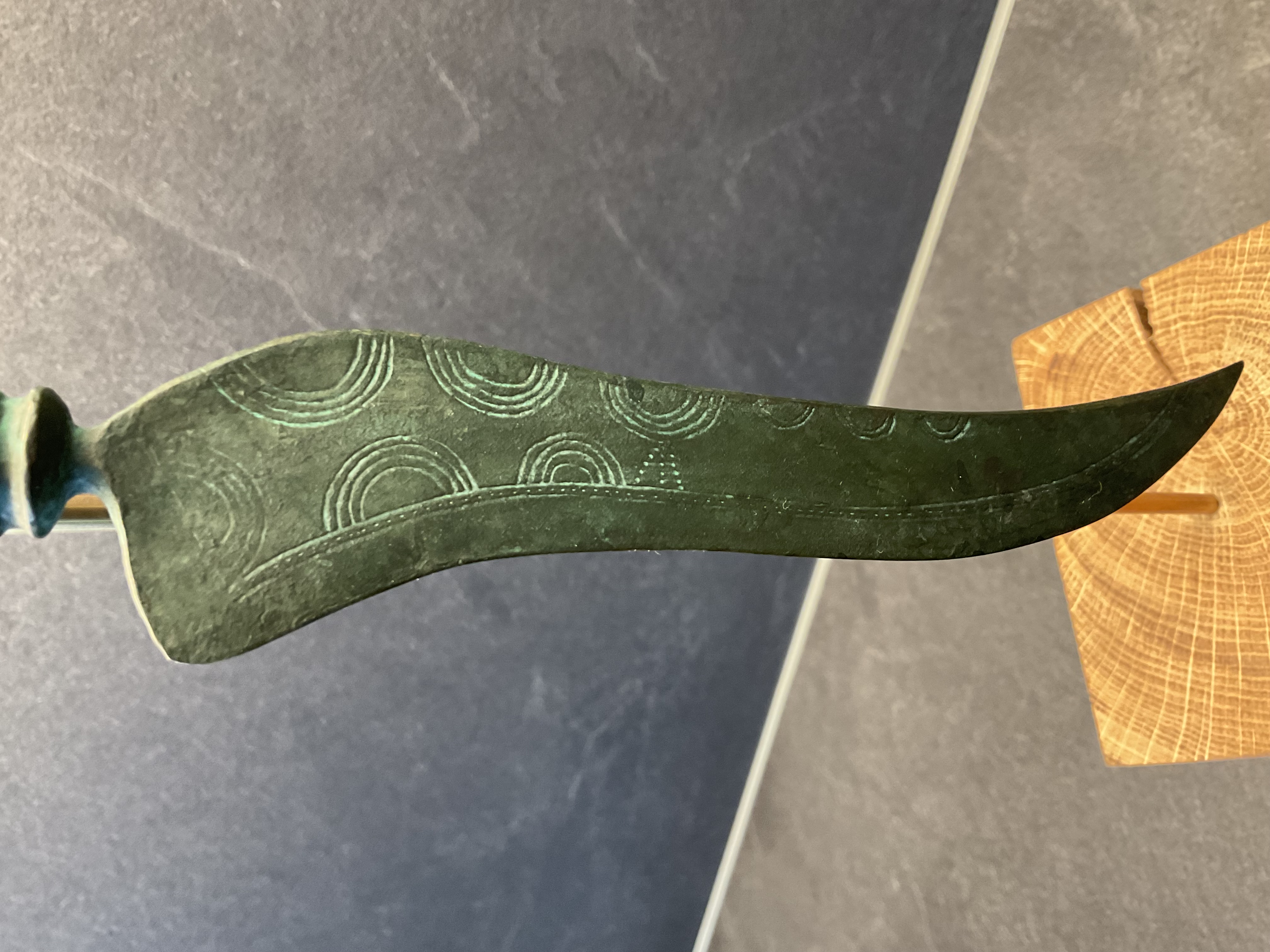 - Ein handgefertigtes und graviertes Sockelschild rundet das Bronzezeitliche Messer ab.
