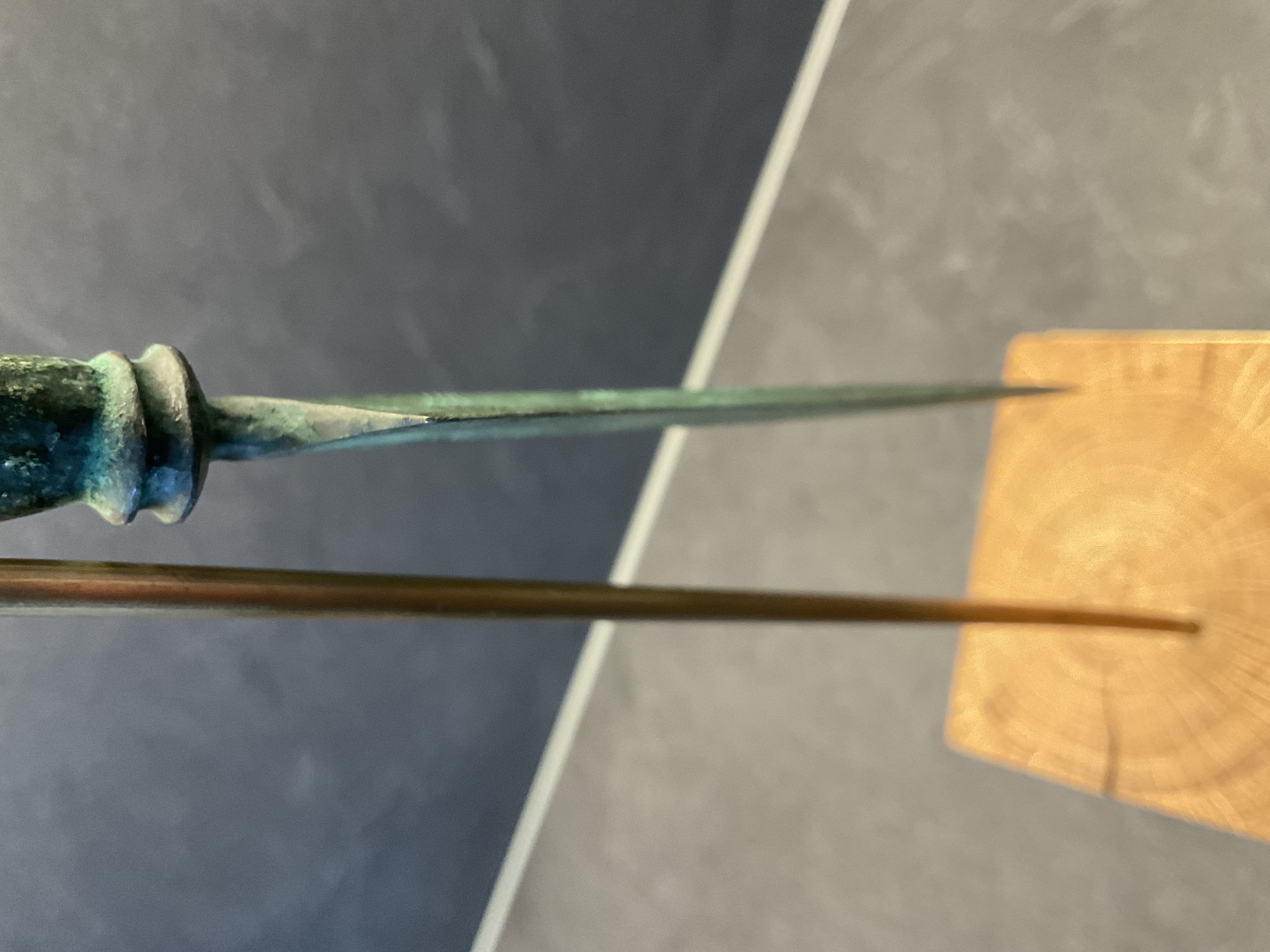- Die Klinge wurde aus Bronze im Verhältnis 86% Kupfer zu 14% Zinn gegossen, wobei die Spitze zuerst gegossen wurde, um Materialunregelmäßigkeiten zu vermeiden.