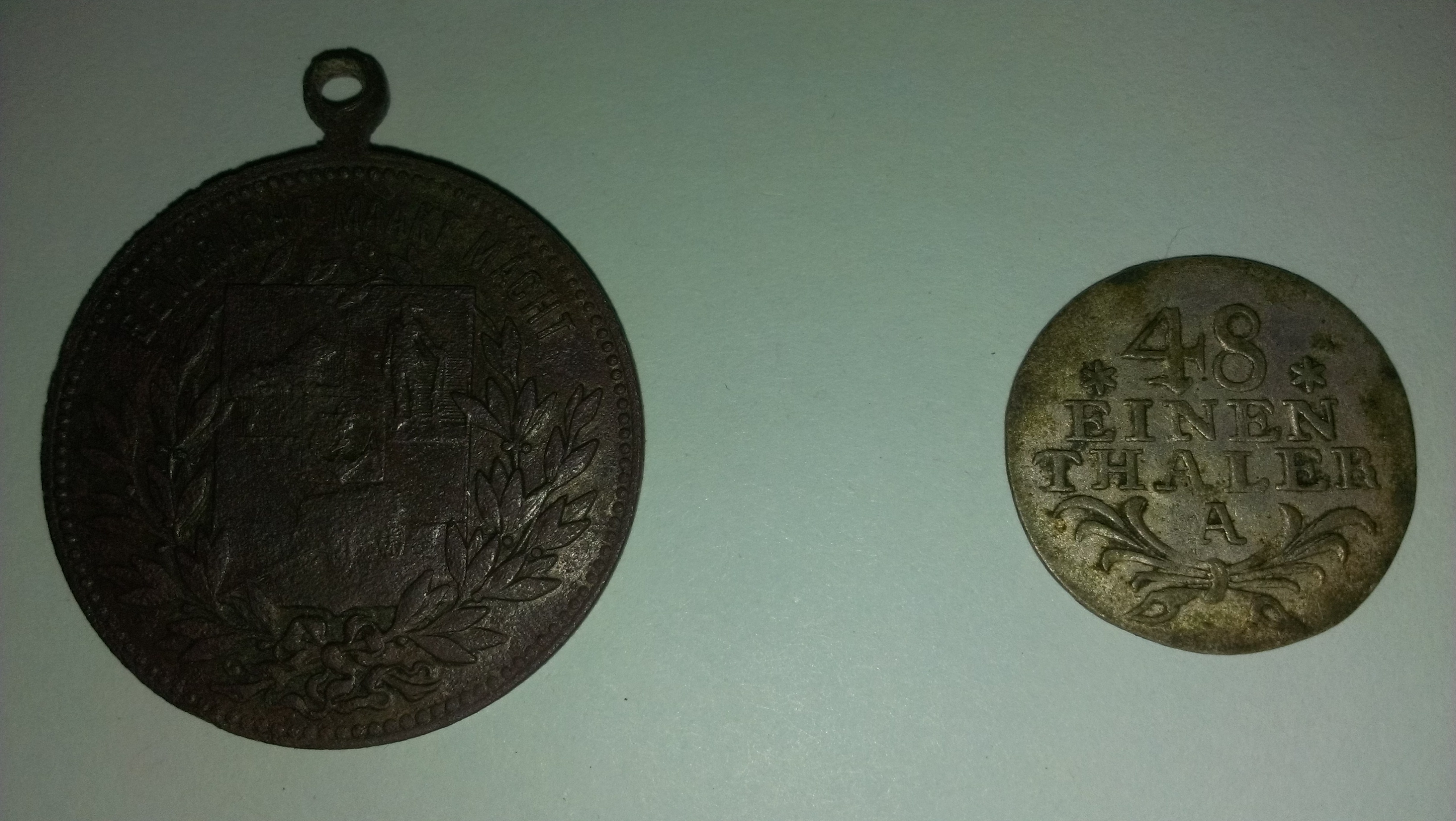 Mega Geiler Fund. Der 48 einen Reichsthaler ist ja sicher silber aber die Rückseite sieht fast nich so aus.. Was steht auf der Medailie hört sich komisch an