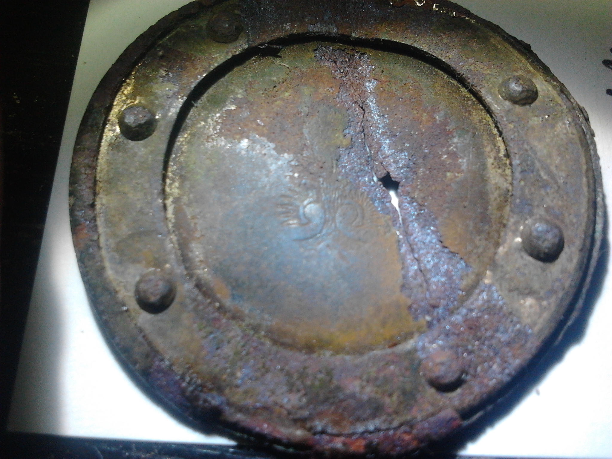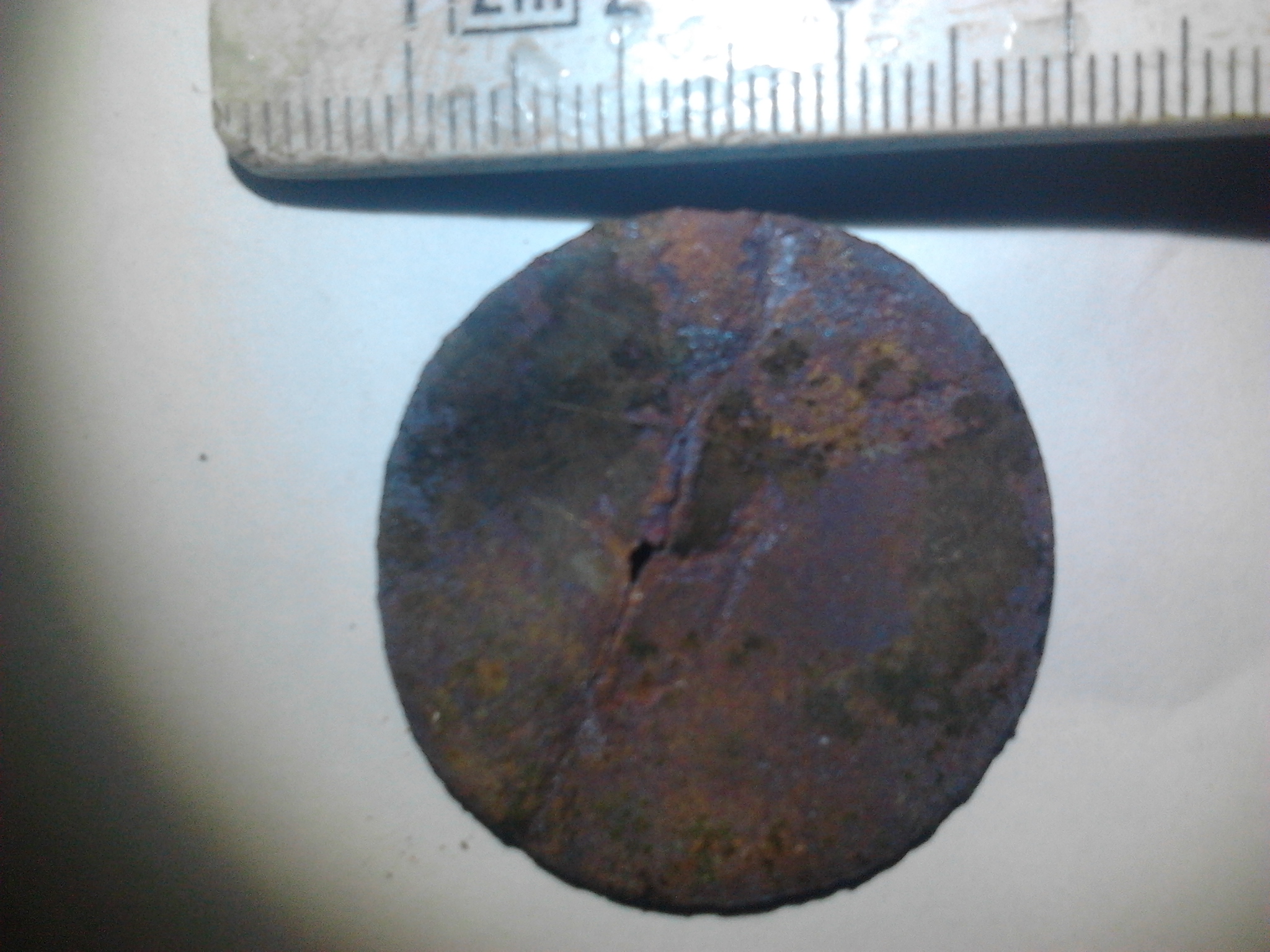 ich habe heute neben 1 reichspfennig 1930 und ner getreideplombe auch diese teil gefunden. beim aufnehmen dachte ich erst an einen dosenboden .doch nach der reinigung kam ein rest einer prägung zum vorschein ebenso wie die nieten am rand.
