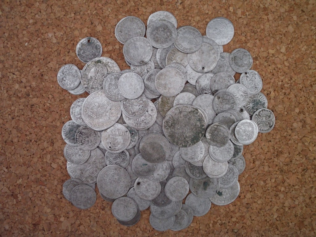 137 Silbermuenze ( 3 Pfenning, 1 Kreuzer, 3 Kreuzer, 6 Kreuzer)1345-1730 die meisten leopold 1, cca 100 Kupfer Muenzen ab 1763 bis 1800 alle Kreuzer Groschen, viele Pferdehufe, Ketten, Bierdosen, das uebliche muell.
